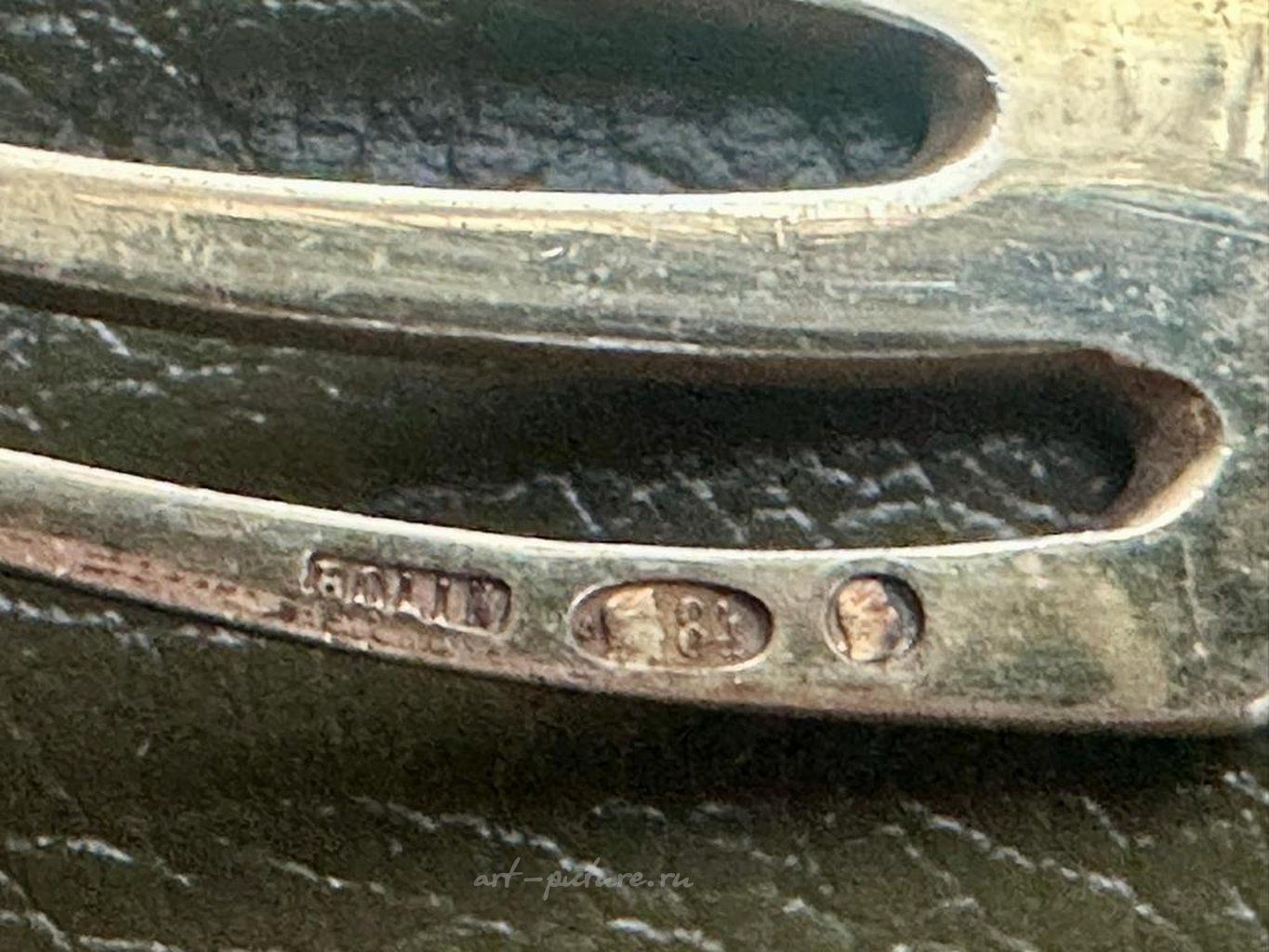 комплект вилок, серебро, 2 шт., 84 проба, общий вес изделий 123, 18.2 см, торговый дом фабрики "Болин", 1896-1907 г., Москва, Российская империя Пара вилок фабрики Болин. Есть в истории русского ювелирного дела имена, навечно вписанные в историю искусства. Таковым является Карл Болин. Фирма "Болин" занимает особое место в истории русского ювелирного искусства. Она была создана в конце XVIII столетия в Петербурге. С 1839 г. Карл Эдуард Болин - придворный ювелир, с 1851 г. - оценщик Кабинета, в 1862 г. ему присваивается звание потомственного почетного гражданина. Предмет уникальный, музейного достоинства! Фигура сфинкса и другого мифического персонажа выполнены на очень высоком художественным уровне. Предмет богато декорирован гирляндами, цветами жемчужника, остролистами, родная двухцветная позолота. Состояние превосходное! Шедевр! Длина: 18 см. Вес: 123 гр. Пробирное клеймо «Женская голова в кокошнике в профиль, направленная вправо» в овальном щитке = удостоверяет, что изделие изготовлено и апробировано в России в период с 1908г по 1917г. Литера греческого алфавита «Дельта», сопровождающая пробирное клеймо в одном контуре = устанавливает, что изделие было апробировано Московским пробирным округом, в состав которого входили Нижегородский Губернский пробирер и Тульский Губернский пробирер. Пробирное клеймо «Женская голова в кокошнике в профиль, направленная влево» = удостоверяет, что изделие изготовлено в России в период с 1896г по 1908г. Клеймо «84» = золотниковая проба в клейме удостоверяет, что изделие изготовлено из высокопробного серебра. Клеймо «BOLIN» = фирменный именник торгового дома фабрики Болин. На предмете дополнительно проставлены клейма советского периода.