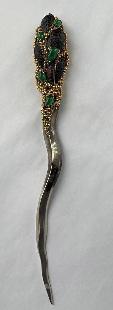Давайте немного углубимся в детали. Ручка с золотыми шариками и жуковыми крыльями вызывает эмоции, напоминающие о тайном мире природы, как в лучших фильмах о приключениях. Это как находка в фильме Индианы Джонса, где каждая деталь может поведать о древних тайнах. Зелёные камни, напоминающие изумруды, привносят нотки загадки и великолепия.