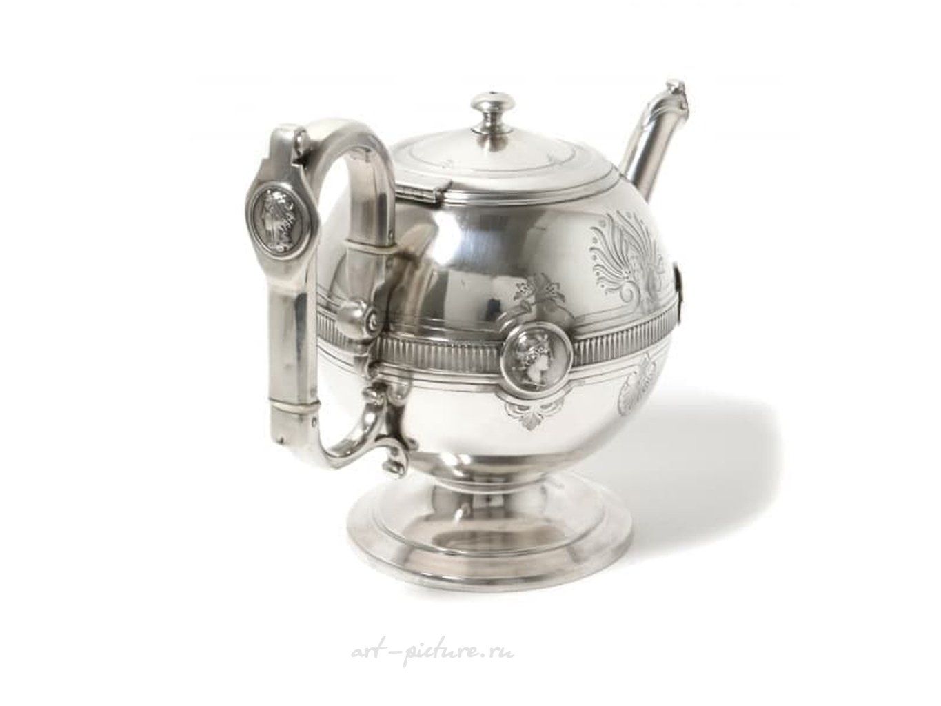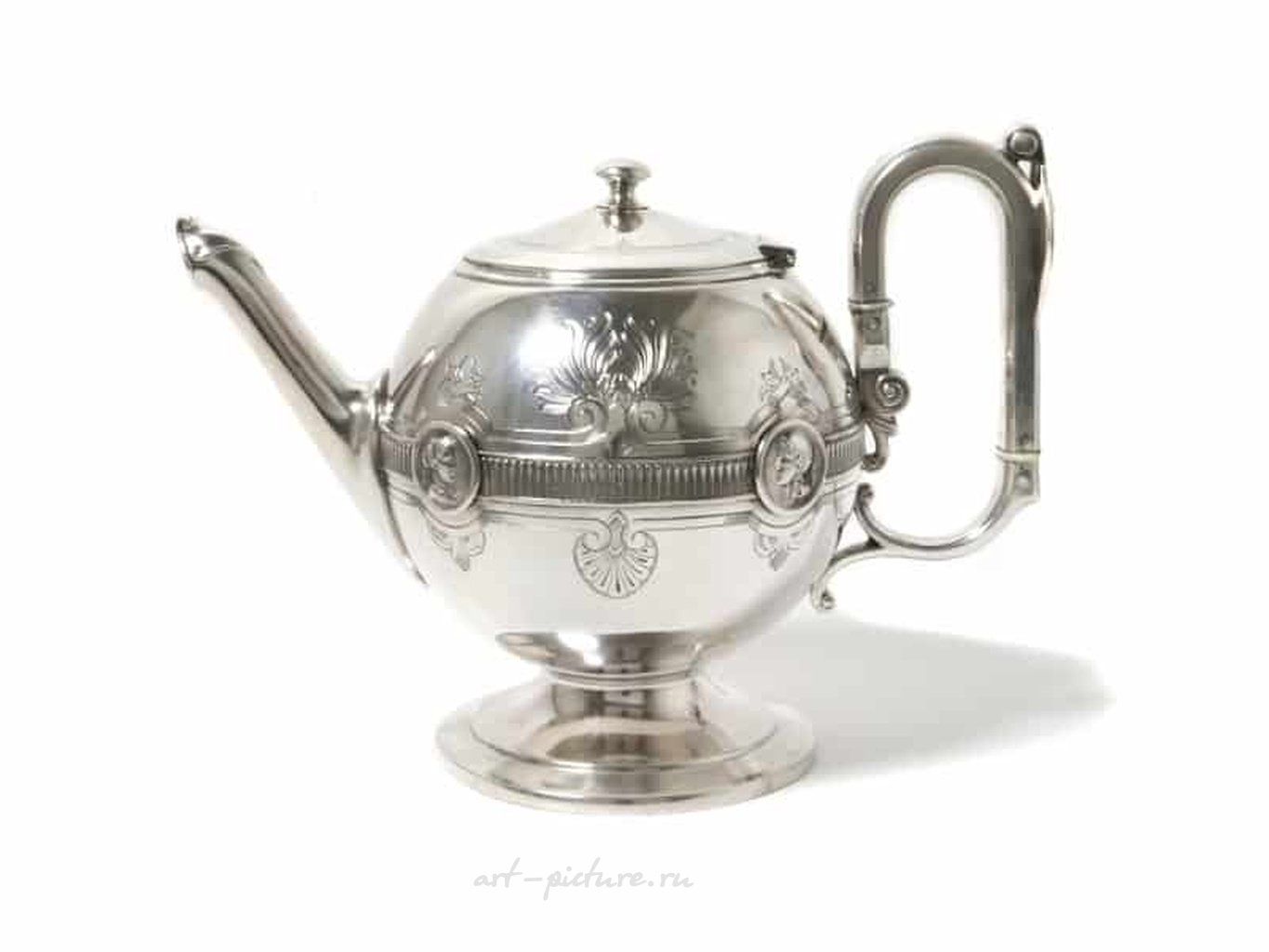 Серебряный чайник в стиле "Medalion" от мастерской Gorham является истинным примером утонченного художественного мастерства, отражающего элегантность и изысканность конца 19 века. Этот стиль, как ты правильно заметил, характеризуется использованием медальонов — не просто декоративных элементов, а настоящих миниатюрных произведений искусства, каждая из которых наполнена своей уникальной историей. Такой подход придает предмету глубину, богатство и символизм, что делает его не только функциональным, но и эстетически значимым артефактом.
