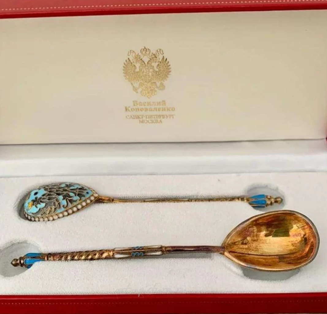 Silver spoons with enamel decor on a gilded background, in a gift case with the inscription "Vasily Konovalенко." Decorated with a double-headed eagle, using the technique of painted and cloisonné enamel. Mark: the number 88 and the master's mark. Material: Silver, Cloisonné enamel, Gilding. Product dimensions: Height - 10 cm, Width - 6.8 cm.