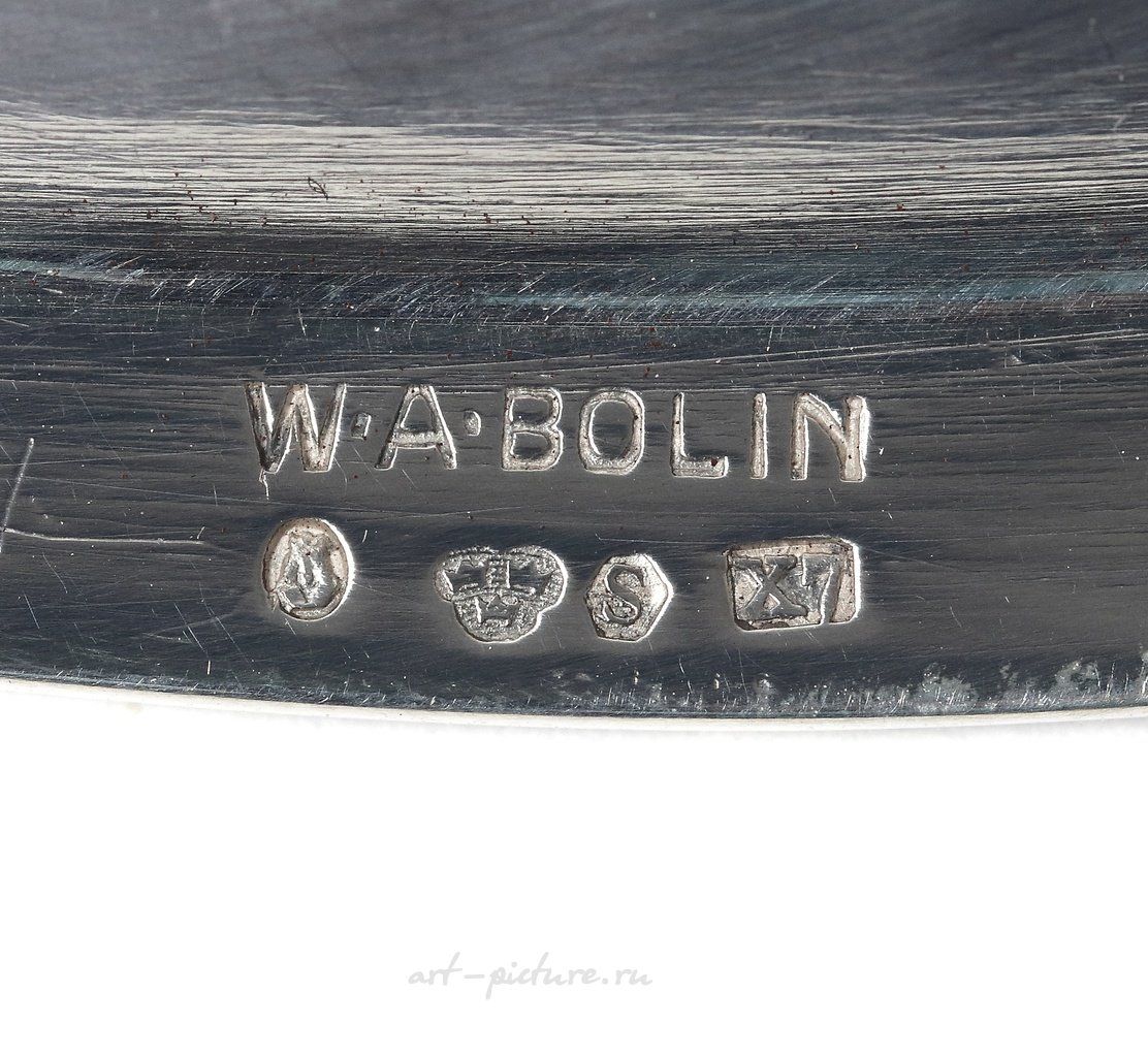 Болин, будучи одним из основных придворных ювелиров России в XIX-начале XX века, мастерски справлялся с сочетанием традиционных ювелирных техник и новаторских подходов, что делает каждое его произведение не только предметом утилитарного назначения, но и настоящим произведением искусства. Например, как вы отметили, серебряный поднос из мастерской W.A. Bolin, выполненный в 1924 году, демонстрирует не только функциональность, но и эстетическую выразительность, от которой трудно отвести взгляд. При подносе изысканное декоративное обрамление границы и тонкий, аккуратный узор на поверхности, который будто охватывает свет, создаёт ощущение того, что данный предмет был создан с особой заботой о деталях.
