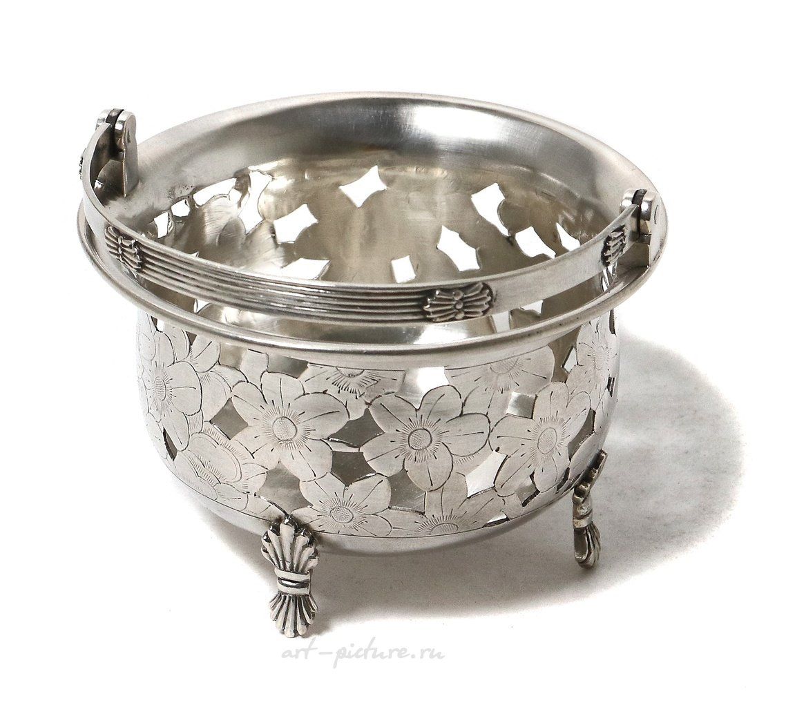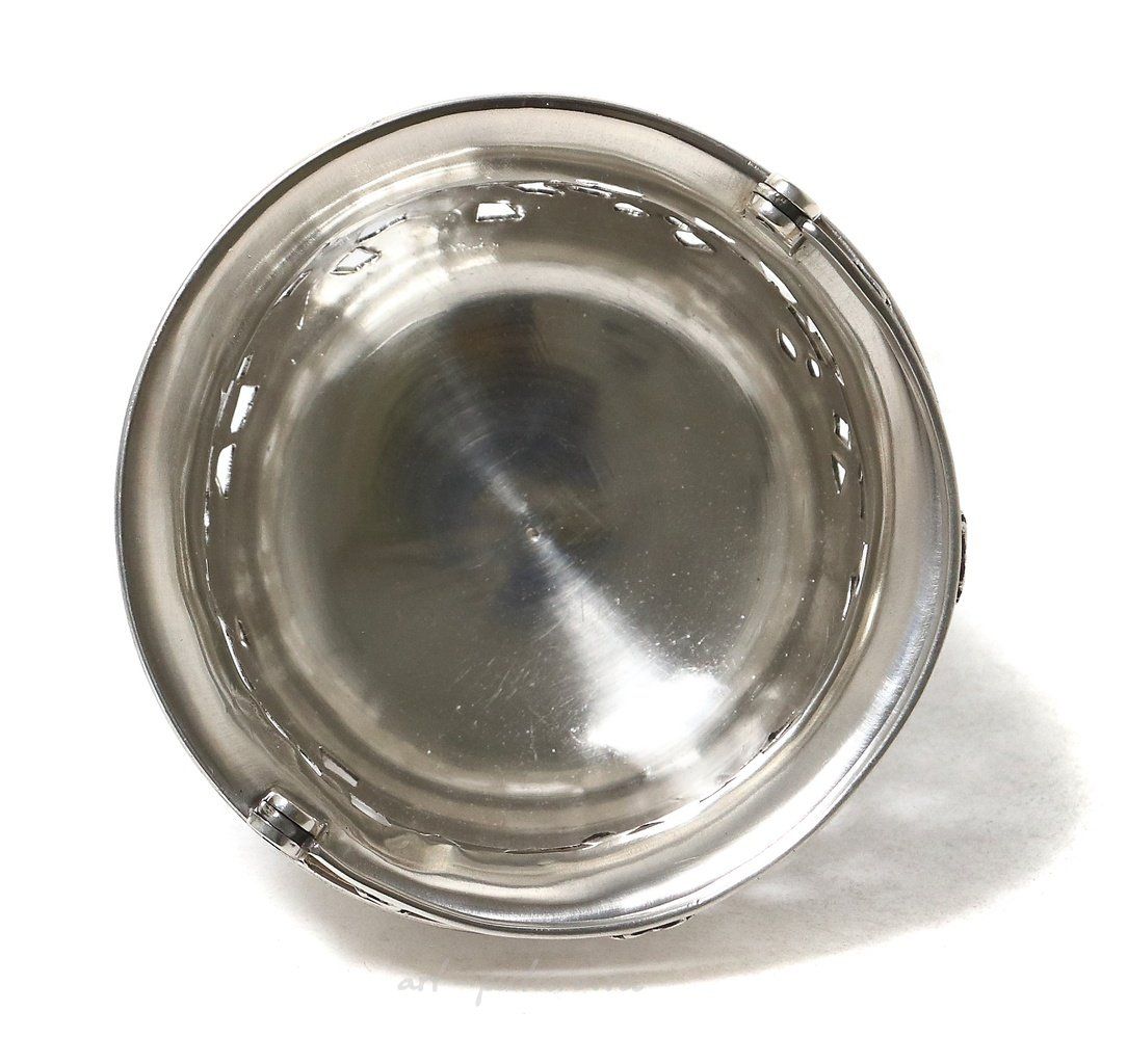 "Silver open-work vase with a reversible handle, decorated with a floral ornament. China, Shanghai, Luen Wo, late 19th - early 20th century. Height at the edge: 5.5 cm, diameter at the top: 8.5 cm; height with the raised handle: 10.5 cm. Weight: 106 grams of silver 950 fineness."