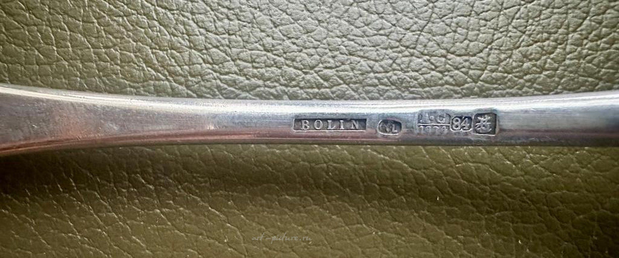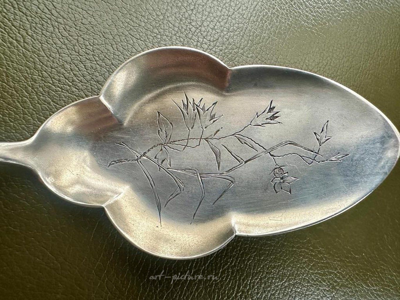 Полностью серебряная лопатка фабрики Болин. Есть в истории русского ювелирного дела имена, навечно вписанные в историю искусства. Таковым является Карл Болин. Фирма "Болин" занимает особое место в истории русского ювелирного искусства. Она была создана в конце XVIII столетия в Петербурге. С 1839 г. Карл Эдуард Болин - придворный ювелир, с 1851 г. - оценщик Кабинета, в 1862 г. ему присваивается звание потомственного почетного гражданина. Предмет уникальный, музейного достоинства! Выполнена на очень высоком художественным уровне. Предмет богато декорирован гирляндами, цветами жемчужника, остролистами. Состояние превосходное! Шедевр! Вес: 150 гр. Пробирное клеймо «Женская голова в кокошнике в профиль, направленная вправо» в овальном щитке = удостоверяет, что изделие изготовлено и апробировано в России в период с 1908г по 1917г. Литера греческого алфавита «Дельта», сопровождающая пробирное клеймо в одном контуре = устанавливает, что изделие было апробировано Московским пробирным округом, в состав которого входили Нижегородский Губернский пробирер и Тульский Губернский пробирер. Пробирное клеймо «Женская голова в кокошнике в профиль, направленная влево» = удостоверяет, что изделие изготовлено в России в период с 1899г по 1908г. Клеймо «84» = золотниковая проба в клейме удостоверяет, что изделие изготовлено из высокопробного серебра. Клеймо «BOLIN» = фирменный именник торгового дома фабрики Болин.