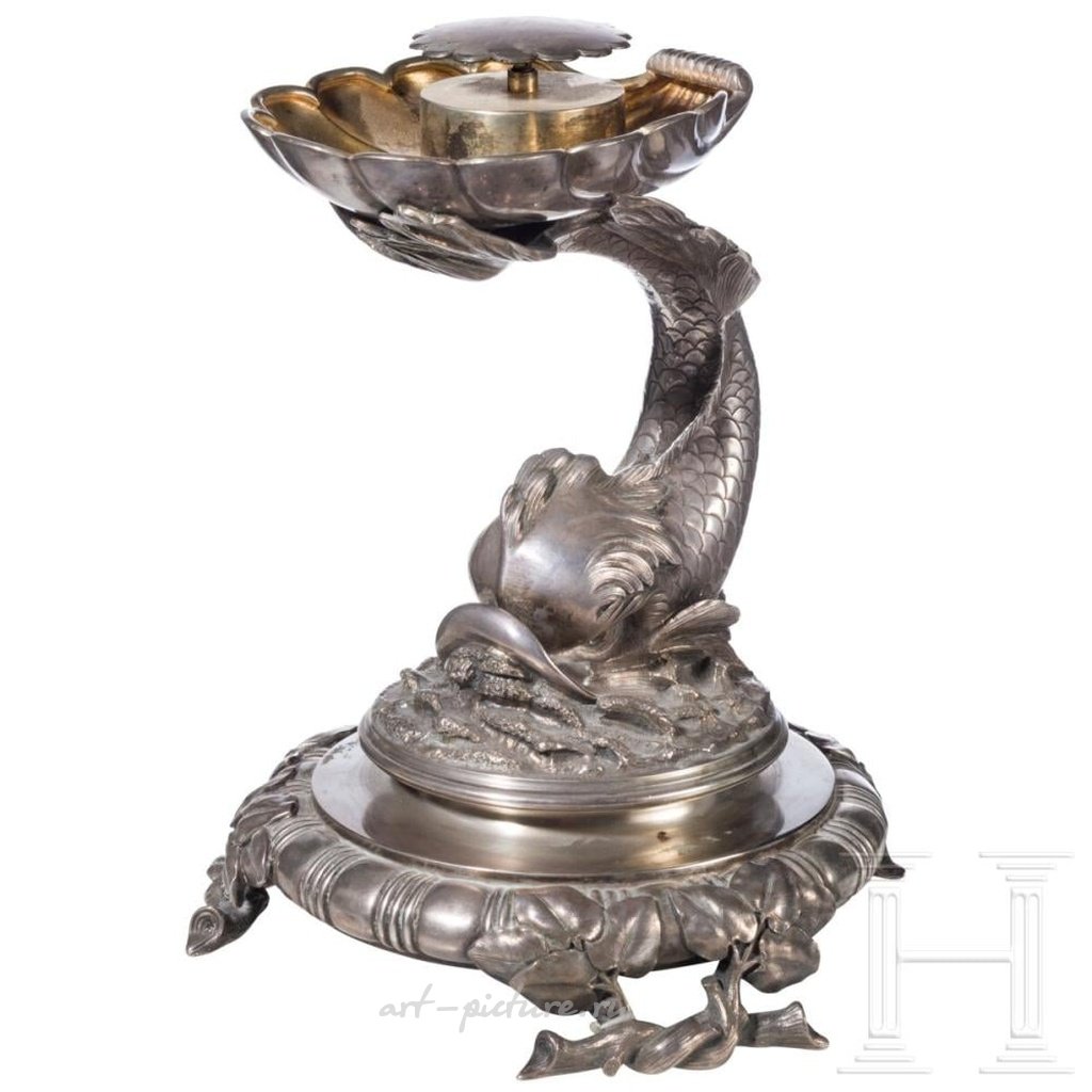 Stem in the form of a dolphin with delicately engraved scales holding a seashell with her flukes. Stamped with the assayer's mark, 84-standard, and the Cyrillic master mark "GR. GRATSCHEW". Without glass bowl. Dimensions 24 x 17 x 17 cm, weight 2,015 g. Condition: II