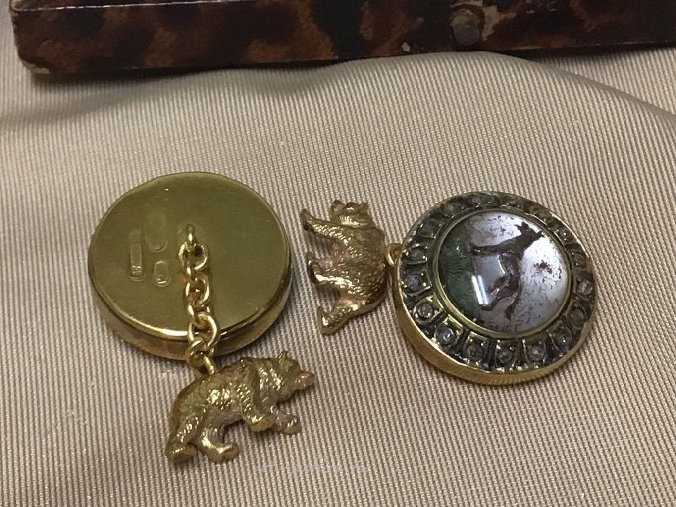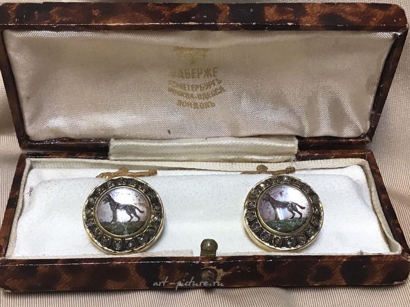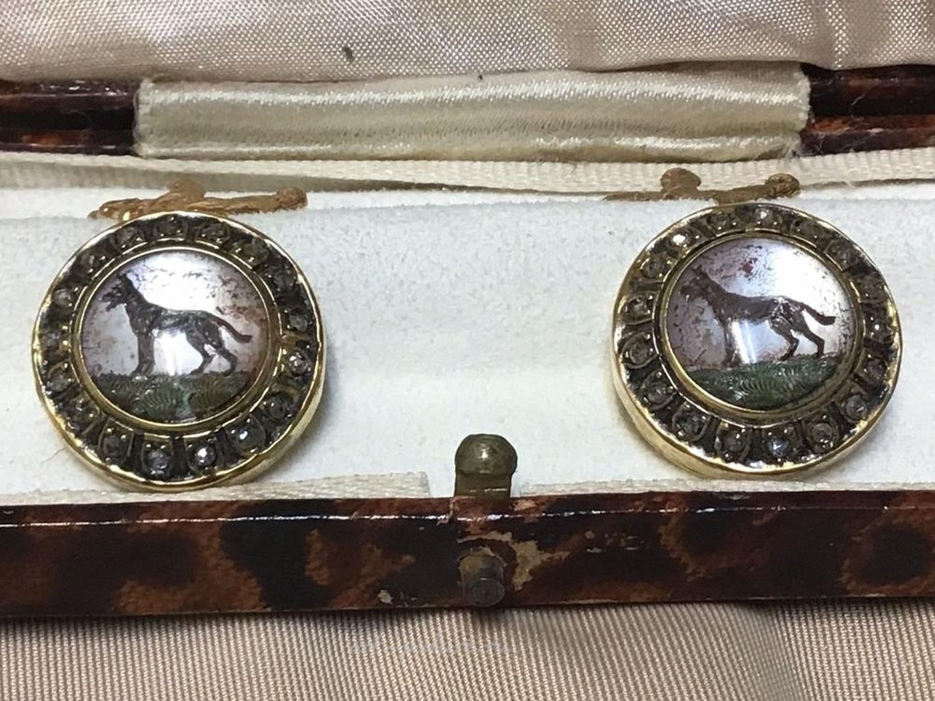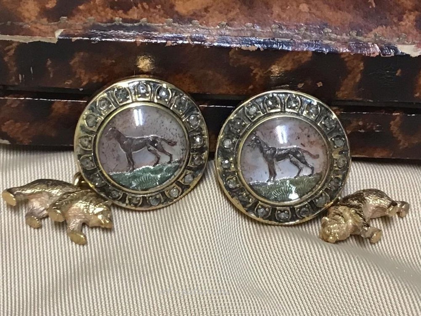 Russian Empire silver 84 gold plated diamond intaglio dog and bear cufflinks Russian Silver Gold Plated Rose Cut Diamond Cufflinks. With fitted signed box. Stamped 84 and maker marks
