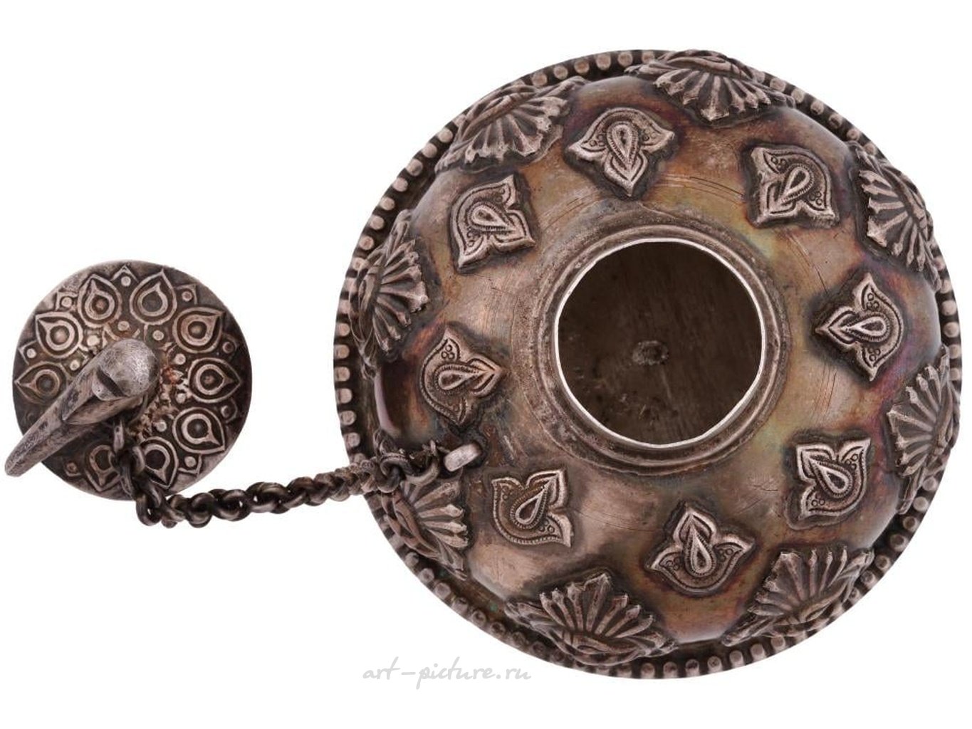 An antique Russian Imperial Bukhara hand crafted silver inkwell pot. Features floral and bird designs to the plaques mounted to the body, with a beaded lower rim. Comes with a lid decorated with a bird figurine on top. Linked to the pot with a chain. Hallmarked to the base with a 84 Russian silver proof mark. Circa the early 20th century. Weight: 142 g. Antique Inkwell Bowls And Religious Collectibles.