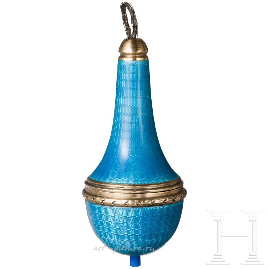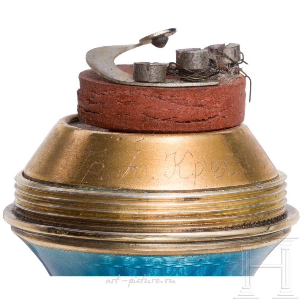 Silver gilt, blue translucent enamel on wave guilloche ground, laurel decoration. Dimensions 8.5 x 4 cm. Weight 52 g. Enamel repaired in some places. Without hallmarks. Inside incised Russian inscription "Gr. A. Kreuts". This is probably Count Alexander Alexandrovich Kreuts (1883 - 1948), Russian cavalry captain of the 16th Hussar Irkutsk Regiment and bearer of the St. George's Arms for bravery