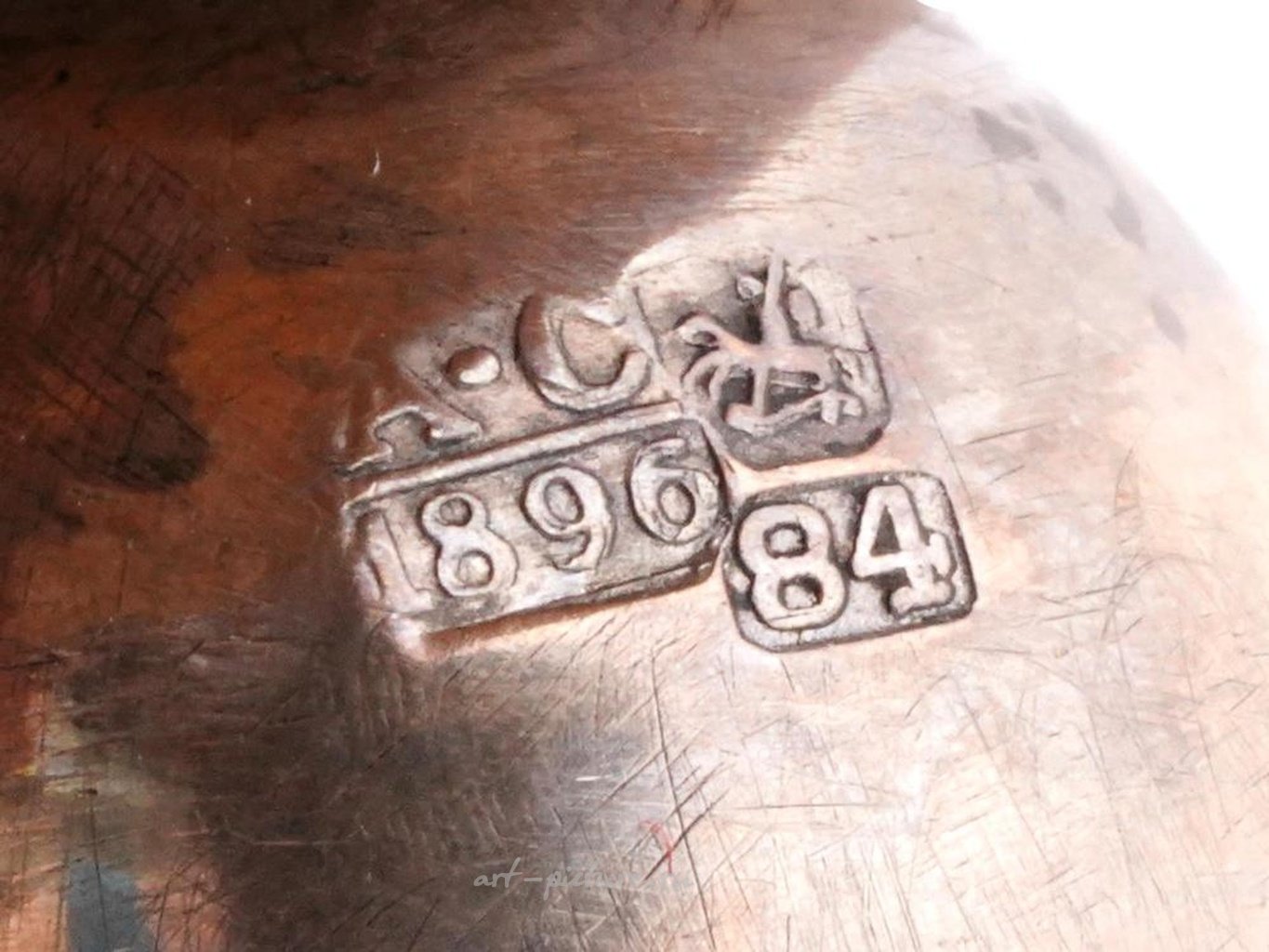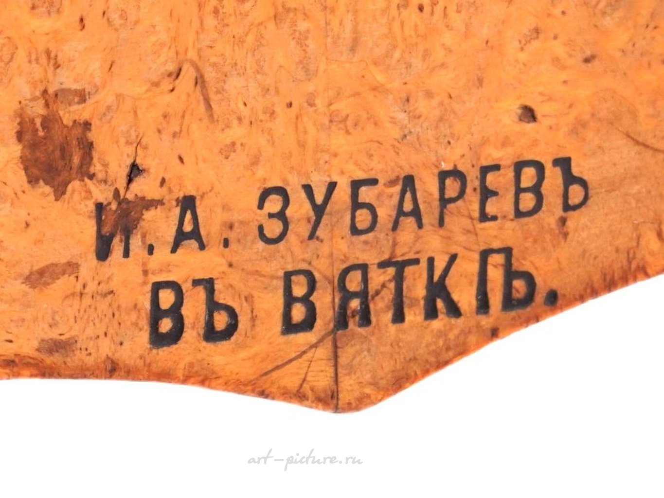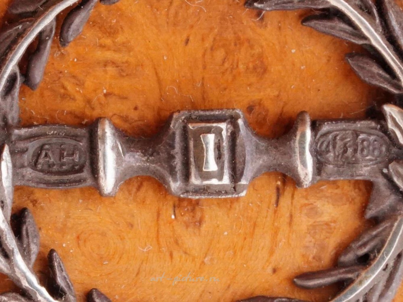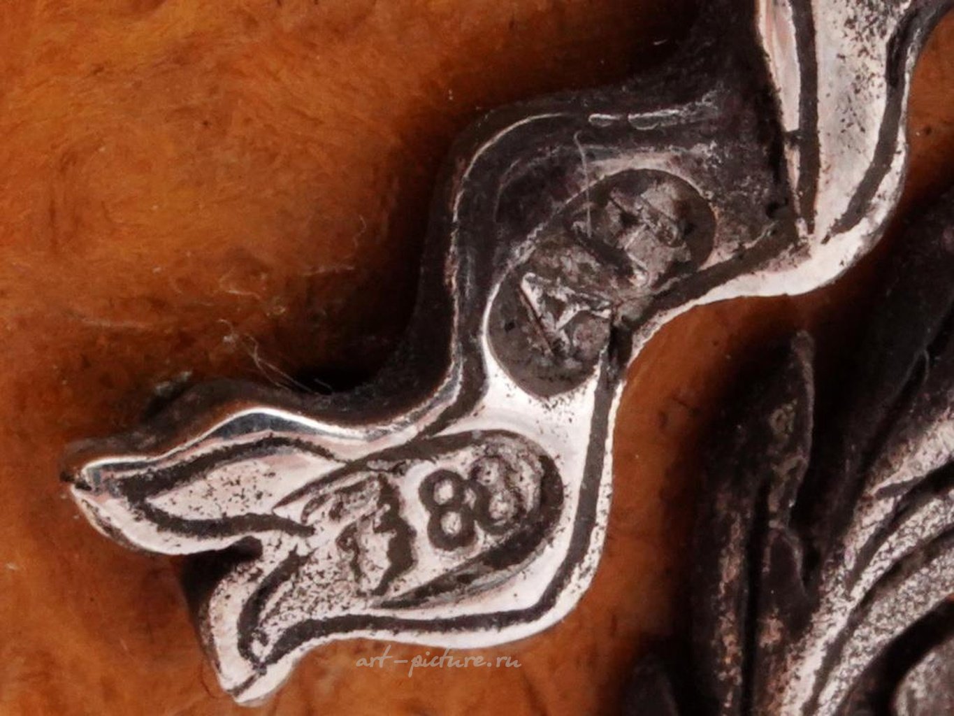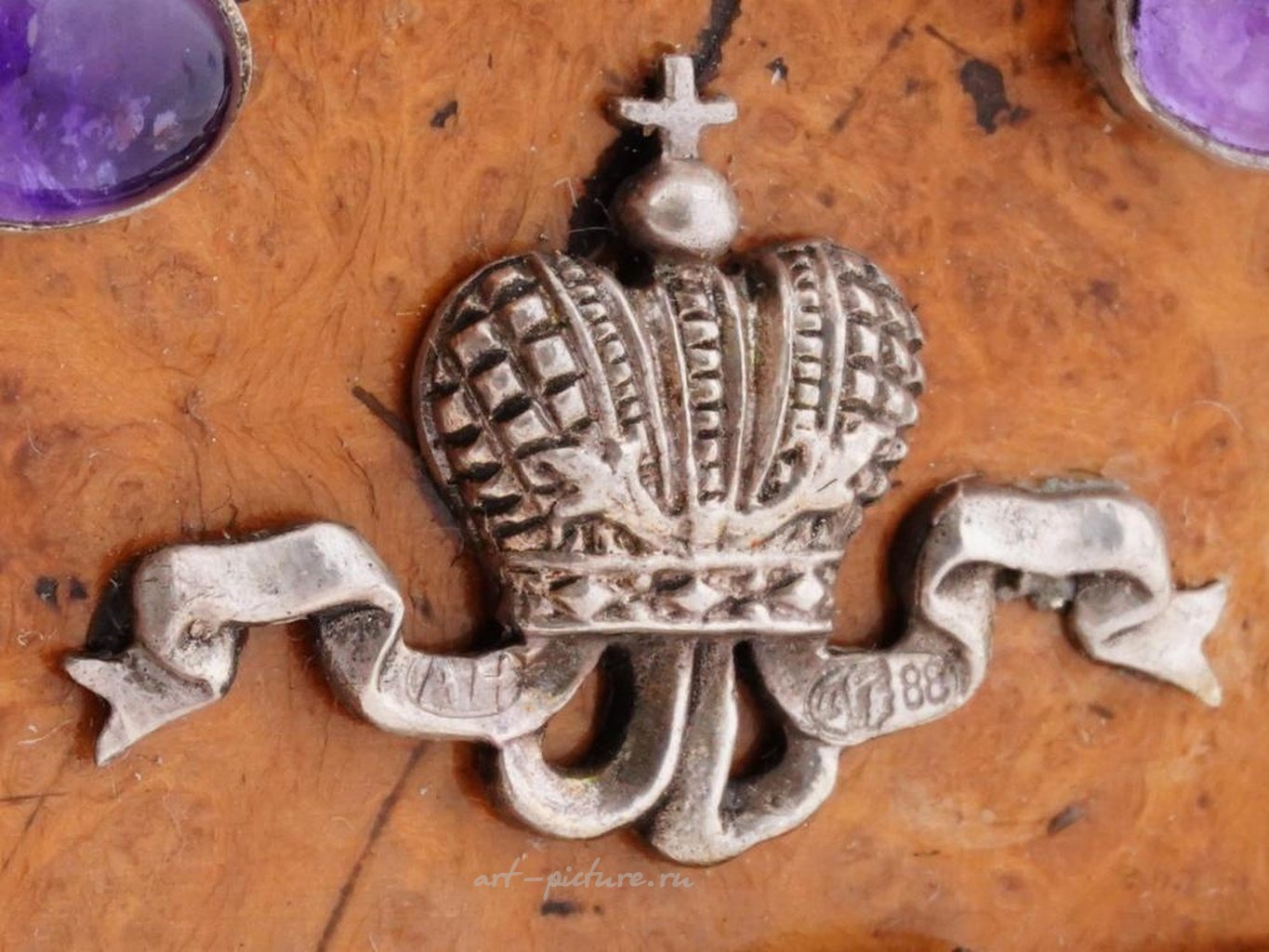 A Russian jewelry or trinket box made of carved and polished burlwood. The piece rests on silver ball feet. The front side and the hinged lid are decorated with silver overlay representing the Imperial Eagle, a combined monogram of the emperors Alexander I and Nicholas II, and floral garlands. The overlay is accentuated with cobalt blue enamel and amethyst cabochons. The interior is lined with velvet. Marked I.A. Zubarev in Vyatka on