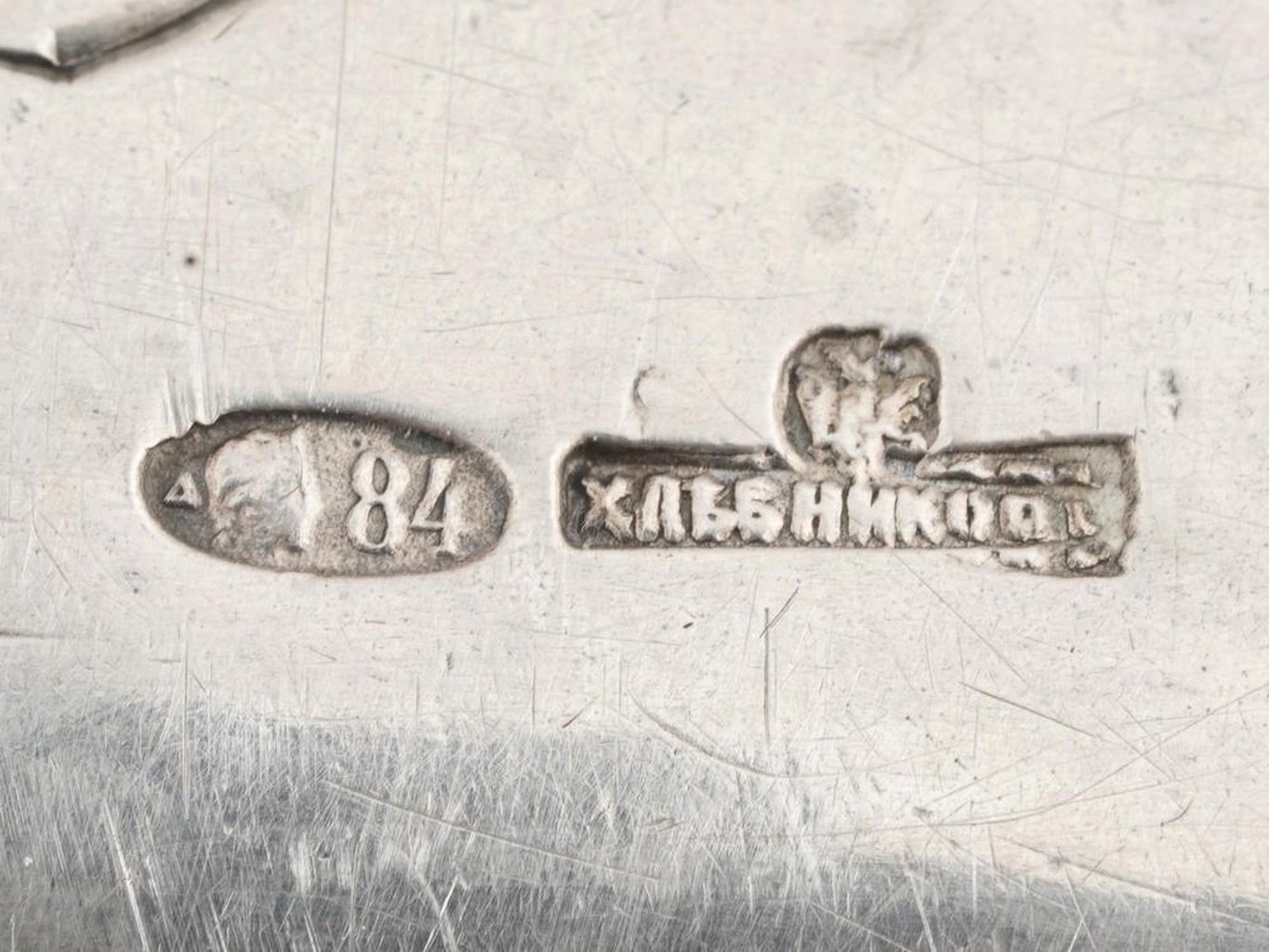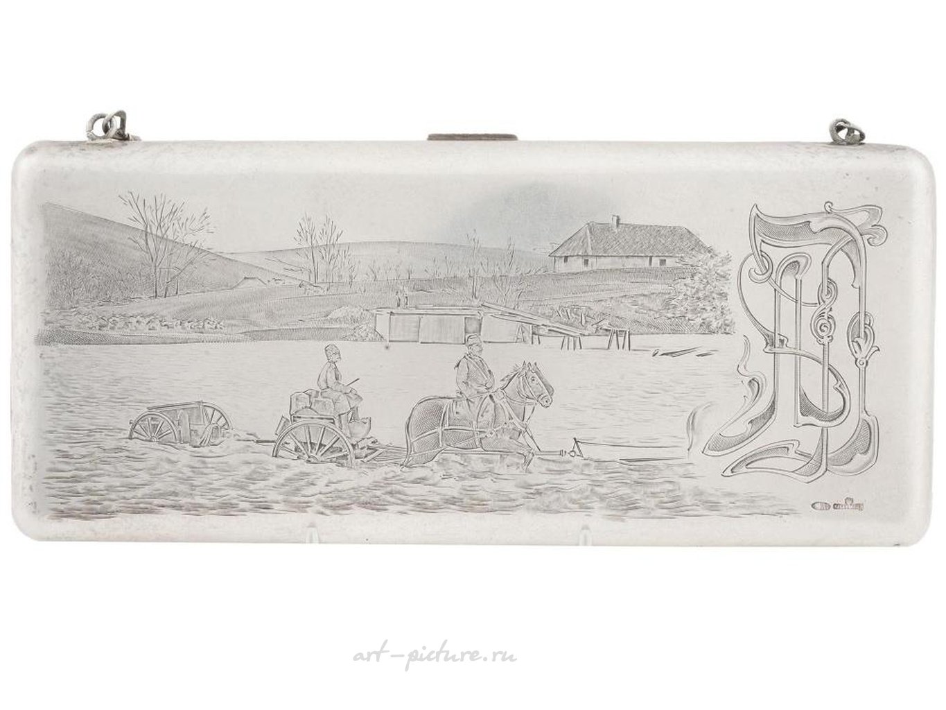 An Imperial Russian silver clutch purse with a hinged lid and chain handle. The front cover is decorated with a hand-engraved miniature depicting Cossacks dragging a cannon across the river, with stylized initials on the right. The item is lined with leather inside and has four compartments. Hallmarked on each side of the purse, on the clasp, and on the chain with an 84 silver standard, and the Cyrillic KHLEBNIKOV makers mark. Ivan Khlebn