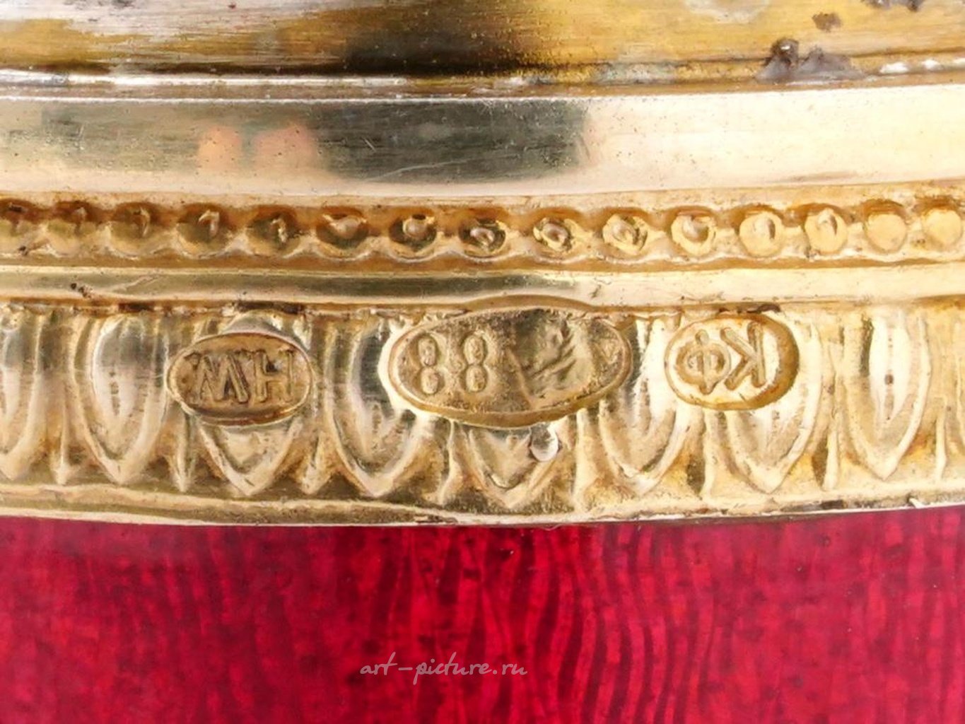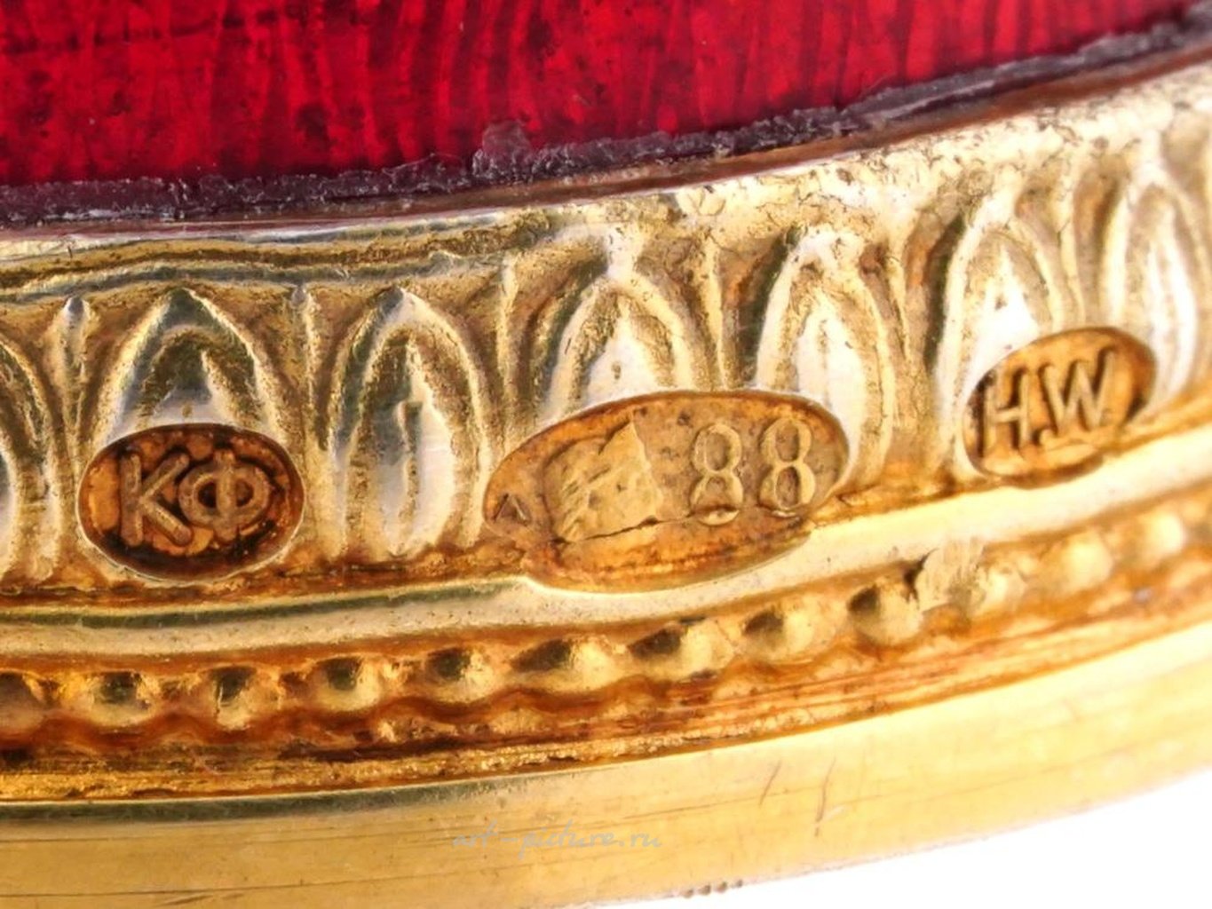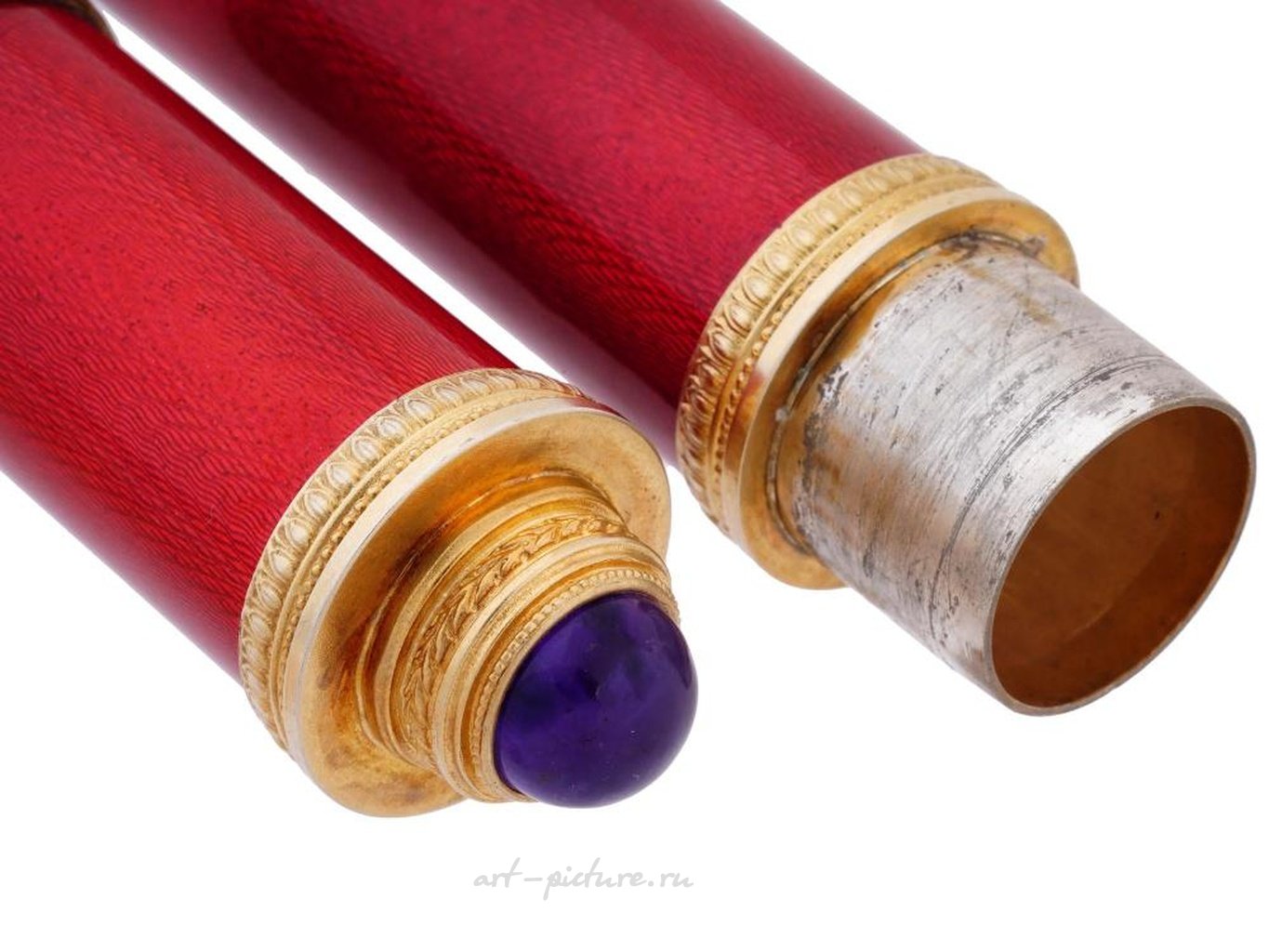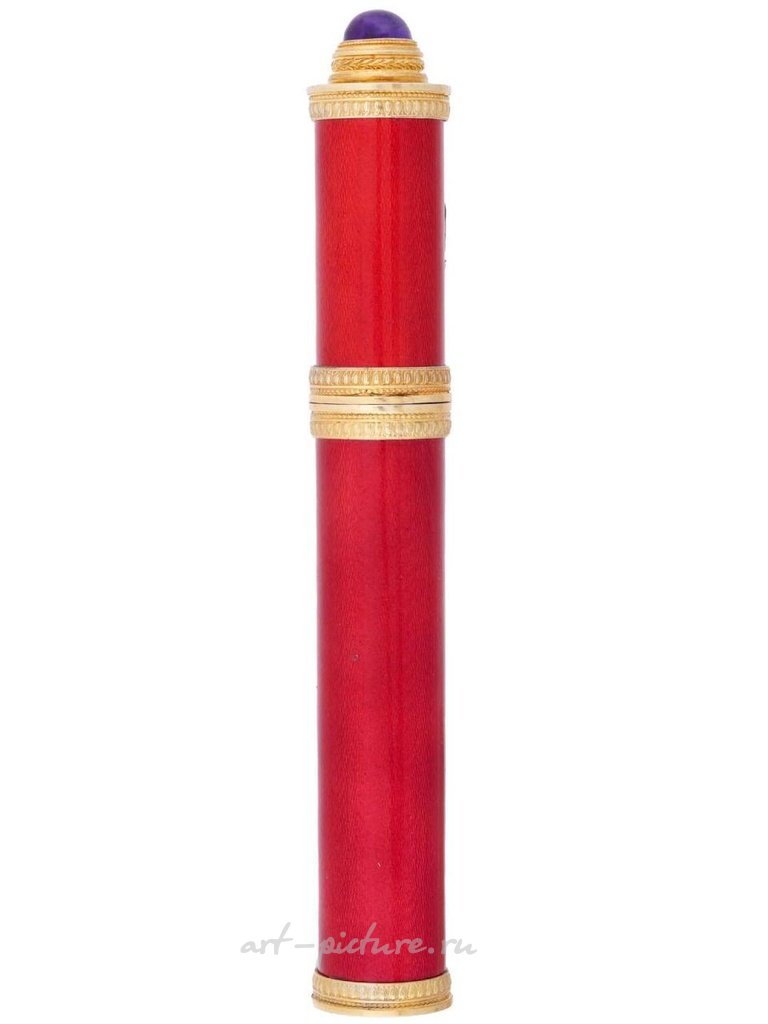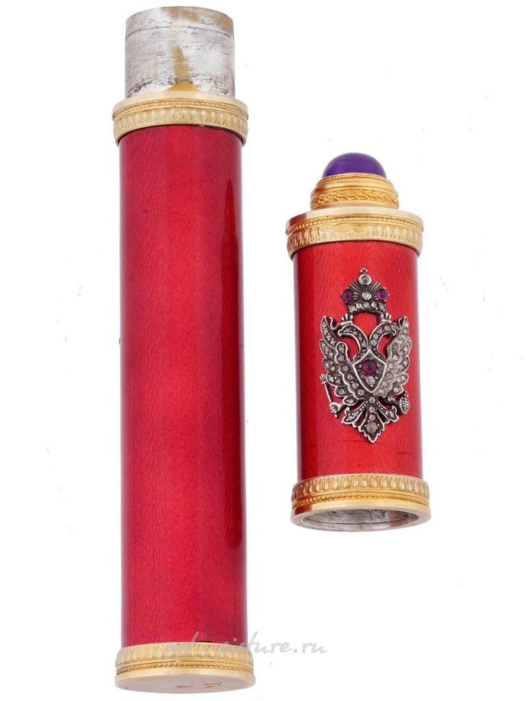 A Russian gilt silver cigar case. The body of the case is covered with red guilloche enamel. The cap is decorated with an overlay Imperial eagle embellished with diamonds and amethyst cabochons. The cap is topped with a large amethyst cabochon. Hallmark of 88 silver standard and makers mark are on the bottom and rims. Total Weight: 228 grams. The item comes in original box. Russian Silverware And Jewelry, Luxury Tobacciana Accessories.