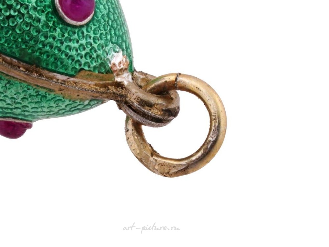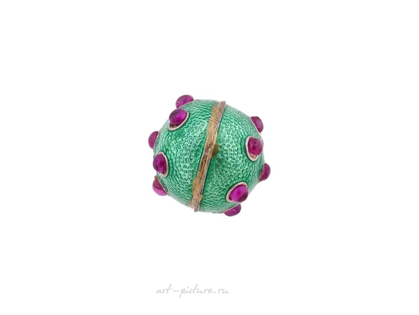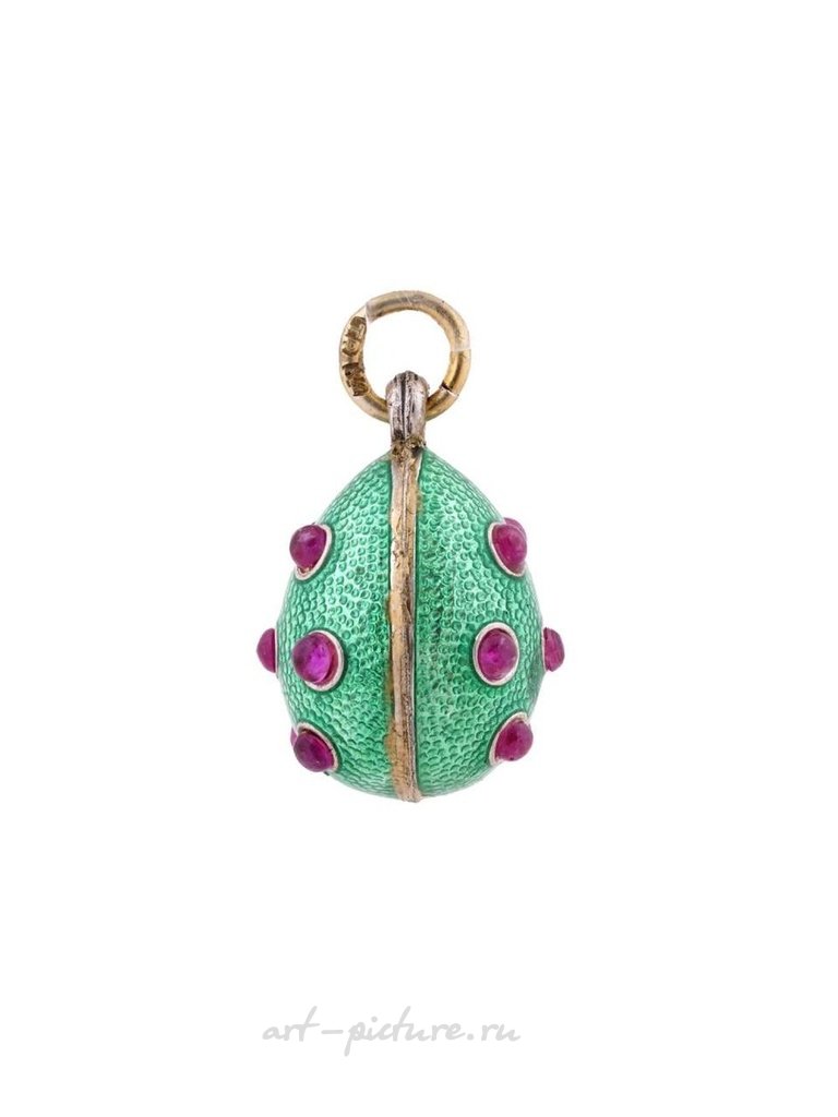 A Russian 84 gilt silver and enamel pendant made in the shape of an Easter egg. The exterior of the egg is covered with a shimmering green guilloche enamel and set with round cabochon cut rubies. Hand Crafted Fine Jewelry, Russian Silver Ware For Collectors, Gifts And Accessories For Women. Total weight: 4 g.