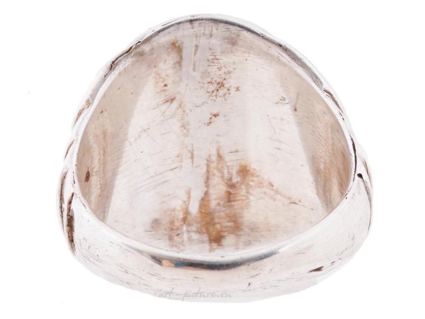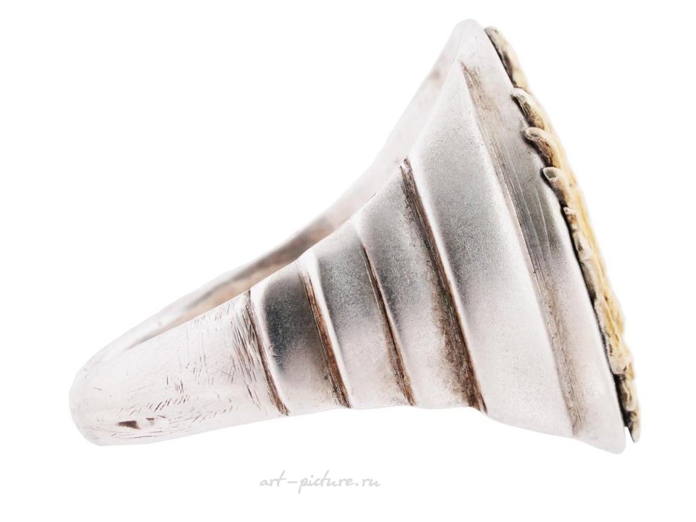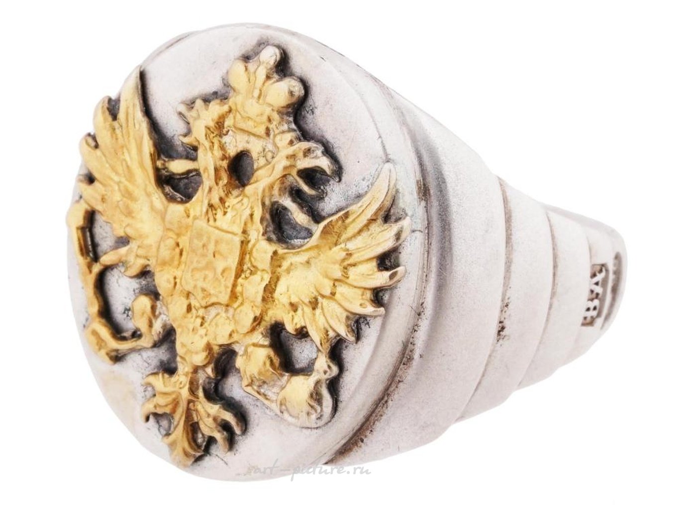 A Russian silver ring applied with the gilt Russian Imperial coat of arms featuring a double headed eagle. Hallmarked with 88 Russian silver and manufacturer marks. Weight: 18 g. Russian Silver Rings and Jewelry Collectibles.
