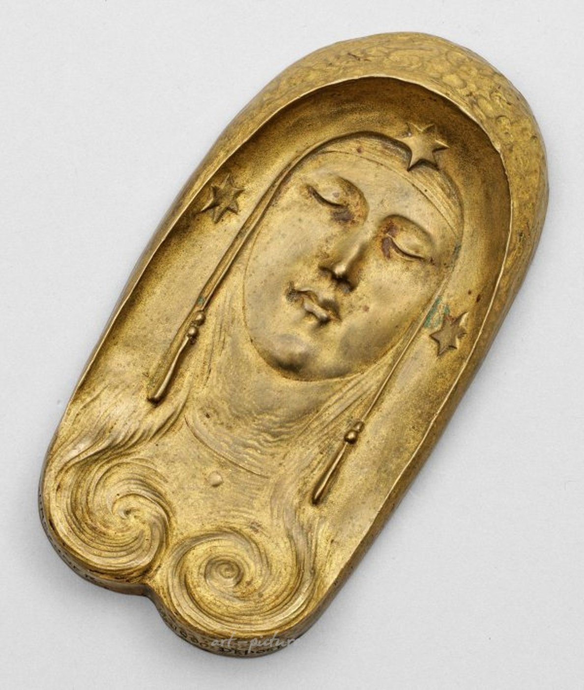Густав Гуршнер. (1873 Мюльдорф-на-Инне - 1970 Вена) Поднос для визитных карточек в стиле ар-нуво с головой девушки и звездами. Бронзовый, позолоченный. Подпись и дата "ГЕРШНЕР. 12.1.1900 НИЗЛОЖЕН". Скульптор, получивший образование в Венской школе искусств и ремесел, познакомился с французским модерном во время поездки в Париж в 1897 году и впоследствии моделировал не только небольшие скульптуры, но и предметы быта. В Вене он участвовал в выставках Сецессиона, а позже и Хагенбунда. Л. 15 см. Позолоченная бронза.