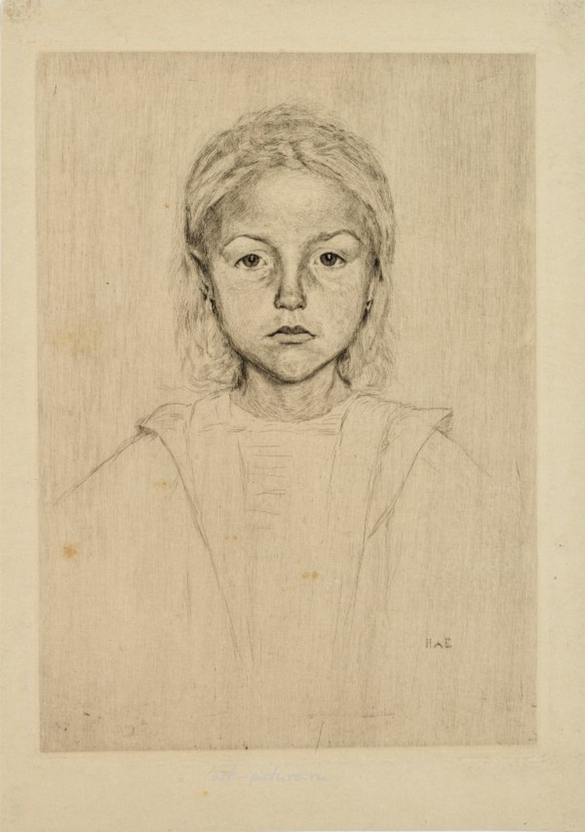 Ханс-ам-Энде (1864, Трир - 1918, Штеттин) "Детская головка". Оригинальное название: офорт/бумага, 1897 год. Монограмма на пластине; редкий лист работы ворпсведского художника с чувственным портретом девушки, изданный тиражом 160 экземпляров в портфолио "Из Ворпведе. Новая серия" (Берлин: Фишер и Франке, 1897) с гравированной титульной виньеткой и 12 оригинальными гравюрами Ханса ам Энде, Фрица Макензена, Фрица Овербека и Генриха Фогелера. Изображение размером примерно 28,2 см х 20,2 см; лист 34,5 см х 24,5 см.