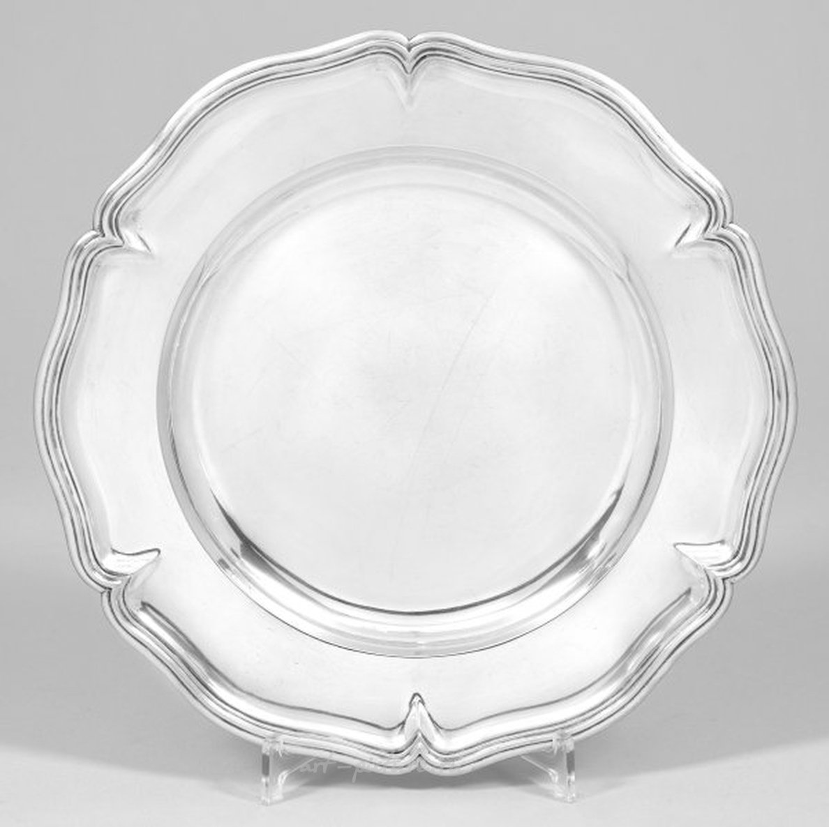 Серебро. В классической форме Чиппендейла. Гладкое, с выпуклым зеркалом, переходящим в постепенно расширяющийся широкий флаг с цветочной формой, изогнутым многократно профилированным краем. Маркировка, клейма производителя "J.C.K." и двойной орёл для поставщиков двора. Вес около 955 г. Диаметр 33 см. См. также Нойвирт, Вена Лексикон, том 1, стр. 296, а также здесь стр. 301. Качественная австрийская серебряная сервировочная тарелка. Маркировка и клеймо производителя. Австрия. Вена. Фирма J.C. Клинкосх. Около 1900 года.