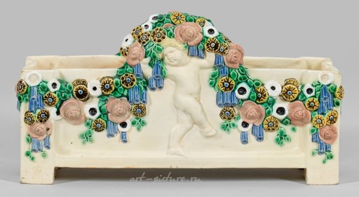 Керамика. Прямоугольная форма с выразительными, пилястровыми углами. Рельефная скульптурная декорация двух путти, поддерживающих окружающий венок из цветов. Модель номер 1002, приписываемая Михаелу Повольни. Фабричные марки Wiener Keramik и Gmundner Keramik. Высота 16,5 см; Ширина 30,5 см. Австрийская Венская нарисованная и глазурованная глиняная жардиньера. Модель номер 1002, приписываемая Михаелу Повольни. Фабричные марки Wiener Keramik и Gmundner Keramik. Австрия. Вена. Wiener und Gmundner Keramik. 1913-1919.