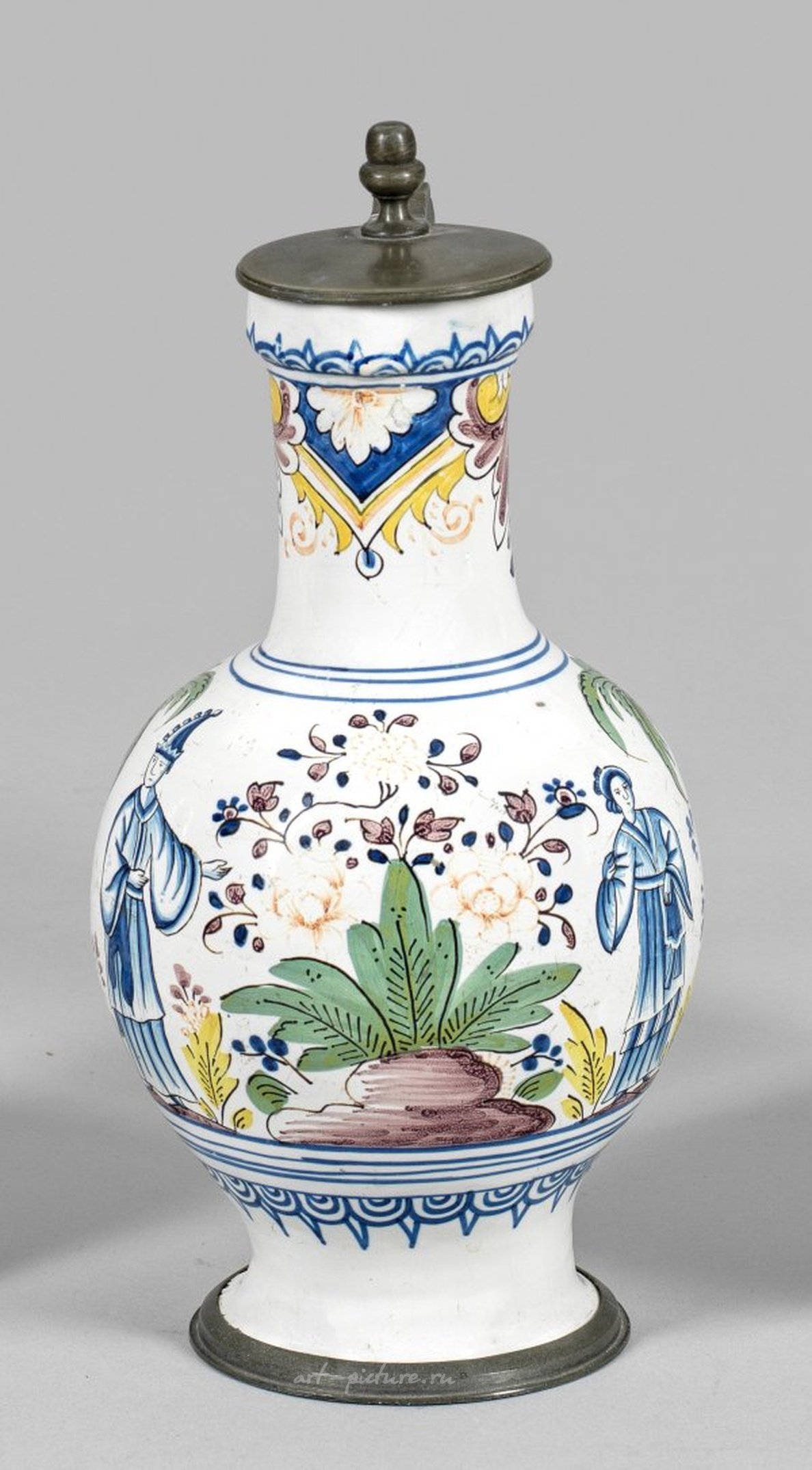 Фаянс. В форме балюстра, с ножкой, овальным корпусом, округлым плечом, переходящим в цилиндрическую шею с коротким носиком, на которую нанесена ручка с вытянутым креплением. Многоцветное остроз арное украшение, на корпусе изображены китаец и китаянка между стилизованными пальмами и пионами. Восстановлено. Серебристо-металлическая ножка и замененная крышка из серебра. Высота 29 см. Немецкий тюрингский, вероятно фаянсовый кувшин из Доротенталь, с многоцветным декором китайца и китаянки. Восстановлено. Тюрингия. Вероятно Доротенталь. 18 век.