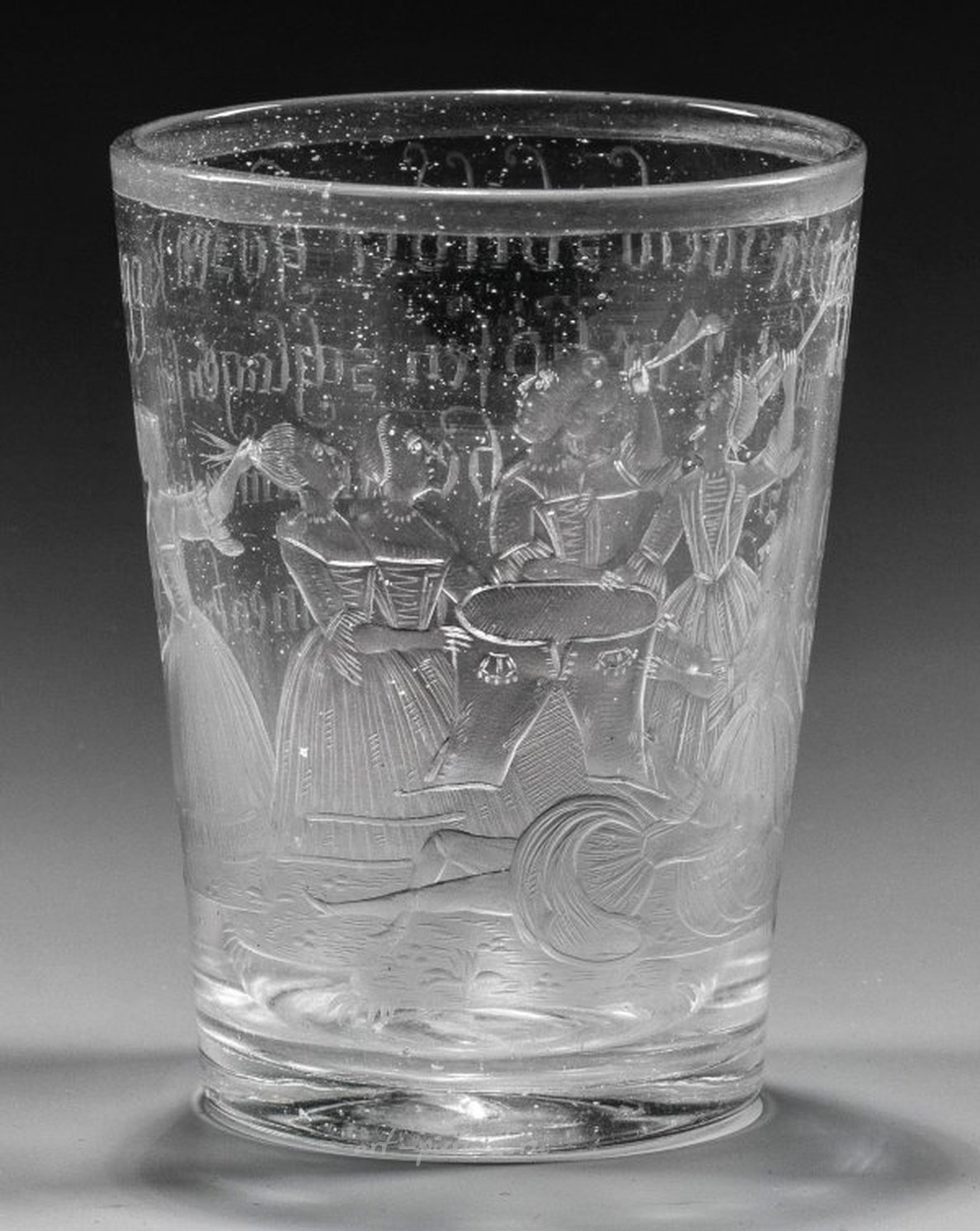 "Битва женщин за брюки" - название этого безцветного стеклянного произведения искусства с тонким изображением. Работа имеет слегка коническую форму и матовую отделку. На одной стороне изображена сцена, в которой семь женщин ссорятся из-за пары мужских брюк. Соответствующая надпись гласит: "Битва женщин за брюки, о паре брюк, здесь семь женщин плачут, потому что никто не сражается за них, брюки их удовлетворяют". Изделие имеет высоту 11,8 см. Изображение и надпись основаны на медицинской гравюре или фотогравюре Альбрехта Шмидта (1667 Ульм - 1744 Аугсбург), пример которой находится в Королевской библиотеке в Копенгагене. Этот редкий чешский гравированный бокал из стекла относится к первой четверти XVIII века.