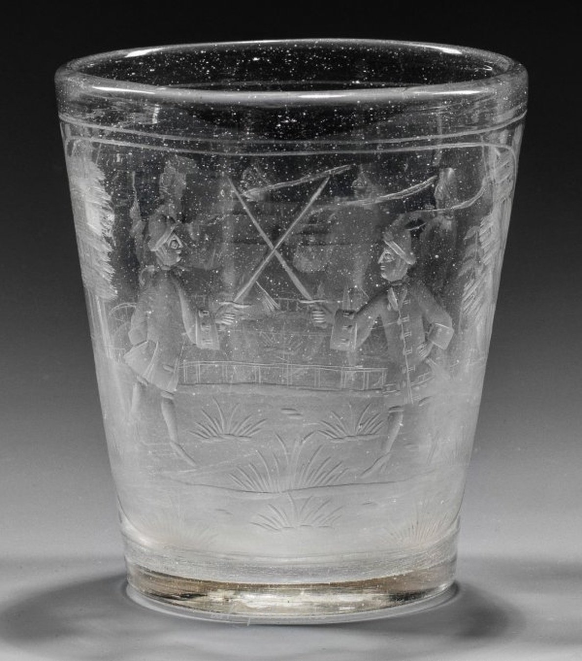 Бесцветное стекло с осколками на земле. Слегка конической формы. Матовая резьба. Два больших прямоугольных изображения. На одной стороне два джентльмена дуелируют с острым оружием в пейзажной обстановке, на противоположной стороне - небольшой отряд из четырех марширующих мужчин, трое с винтовками на плече, первый с барабаном и поднятым пистолетом. Высота: 12 см. Редкий гравированный чешский стаканчик, изображающий дуэль и отряд из четырех вооруженных мужчин. Богемия, первая четверть 18 века.