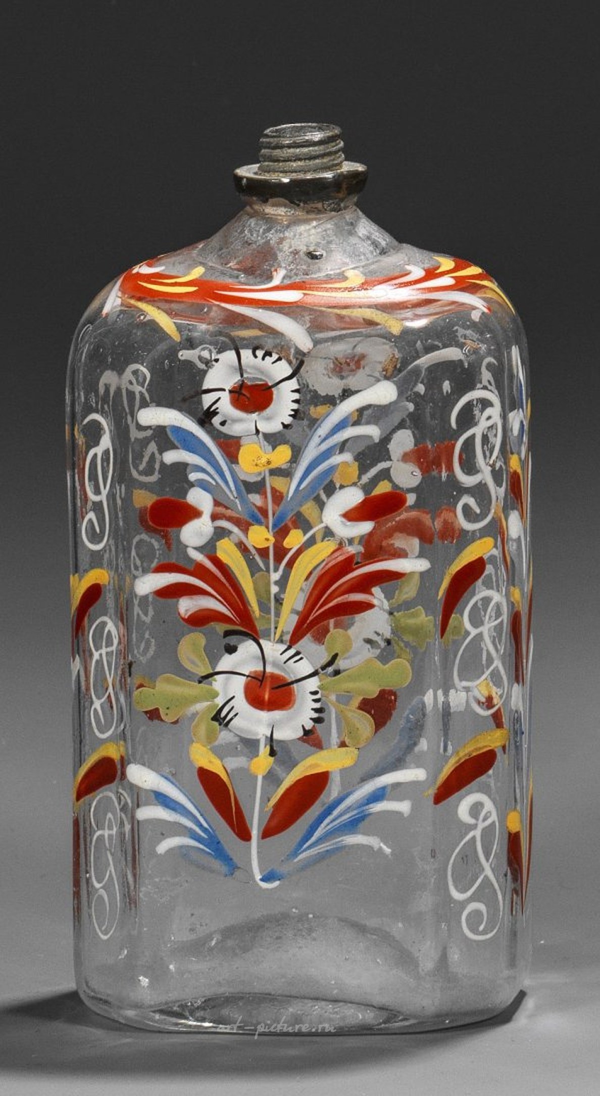 Бесцветное, слегка сероватое стекло с истираниями на дне. Прямоугольной формы с закругленными углами, округлыми плечами и накладным носиком из олова. Полихромное цветочное украшение в непрозрачной эмалевой росписи. Высота 13,5 см. Южногерманская или альпийская полихромная эмалированная и накладная бутылочка для алкоголя. Южная Германия / Альпы. XVIII век.