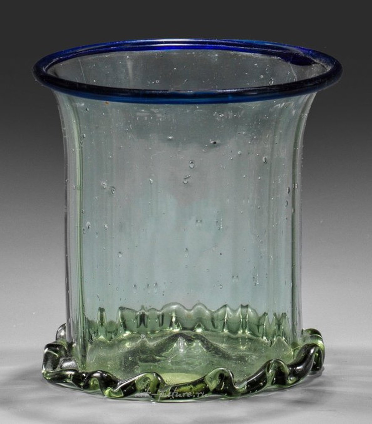 Редкий немецкий зеленоватый стеклянный предмет, продуваемый продольно с прикрепленным синим краем. Он имеет волнистый ножной край, центрально поднятое основание, цилиндрическое тело и выступающий наружу край губы. Ярлык коллекции Рейдля с номером 8667. Высота: 9,5 см; Диаметр: 10,3 см. Этот изысканный предмет - свидетельство мастерства немецкого стеклоизготовления XVII/XVIII веков.