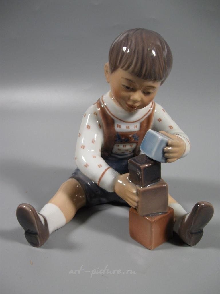 Фарфоровая статуэтка "Мальчик с кубиками". Ручная подглазурная роспись. Дания, г. Копенгаген, Dahl-Jensen. Клеймо производителя. Номер модели - 1167. Инициалы художника, расписавшего статуэтку. Высота - 13 см. Статуэтка первого сорта. Без сколов, повреждений и без реставраций. Porcelain figurine "Boy with blocks". Hand-painted underglaz. Denmark, Copenhagen, Dahl-Jensen. Factory mark. Model - 1167. The initials of the artist painted this figurine. Height 13 cm. Figurine of the first sort. Without chips, damage and restorations. Dahl Jensen DJ_1167