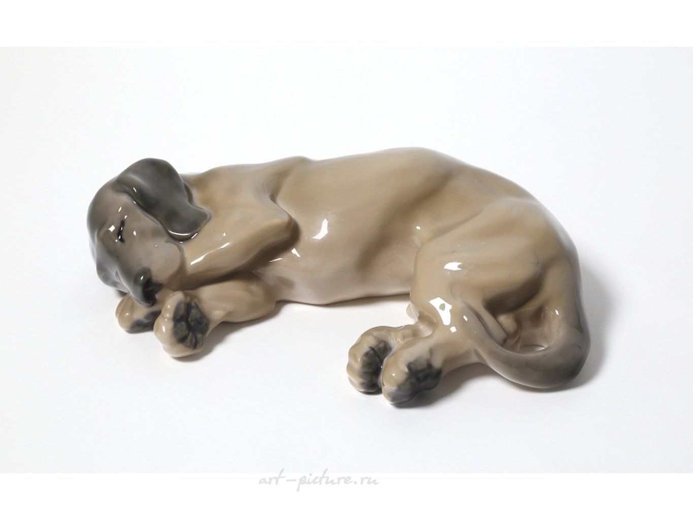 Фарфоровая фигура (статуэтка) "Такса". Ручная подглазурная роспись. Дания, г. Копенгаген, Royal Copenhagen, 1898-1923 гг. Скульптор: Knud Kyhn (годы жизни: 1880-1969). Клеймо производителя. Дизайн раскраски - 1238. Номер модели - 781, производится с 1906 года. "126" - порядковый номер художника, расписавшего статуэтку, работал на фабрике с 1907 по 1919 гг. Размер: 5 х 19,5 см. Статуэтка первого сорта. Без сколов, повреждений и без реставраций. На щеке небольшая рельефная точка от лопнувшего пузырька глазури. Porcelain figurine "Dachshund asleep". Hand-painted underglaze. Denmark, Copenhagen, Royal Copenhagen, the 1898-1923. Sculptor: Knud Kyhn (years of life: 1880-1969). Factory mark. Coloring design - 1238. Model - 781, produced since 1906. «126» - the number of the artist, painted this figurine, worked at the factory since 1907 to 1919. Size:5 x 19.5 cm. Figurine of the first sort. Without chips, damage and restorations. There is a small rough spot on the cheek caused by a burst glaze bubble. Royal Copenhagen 781 (RC_781)