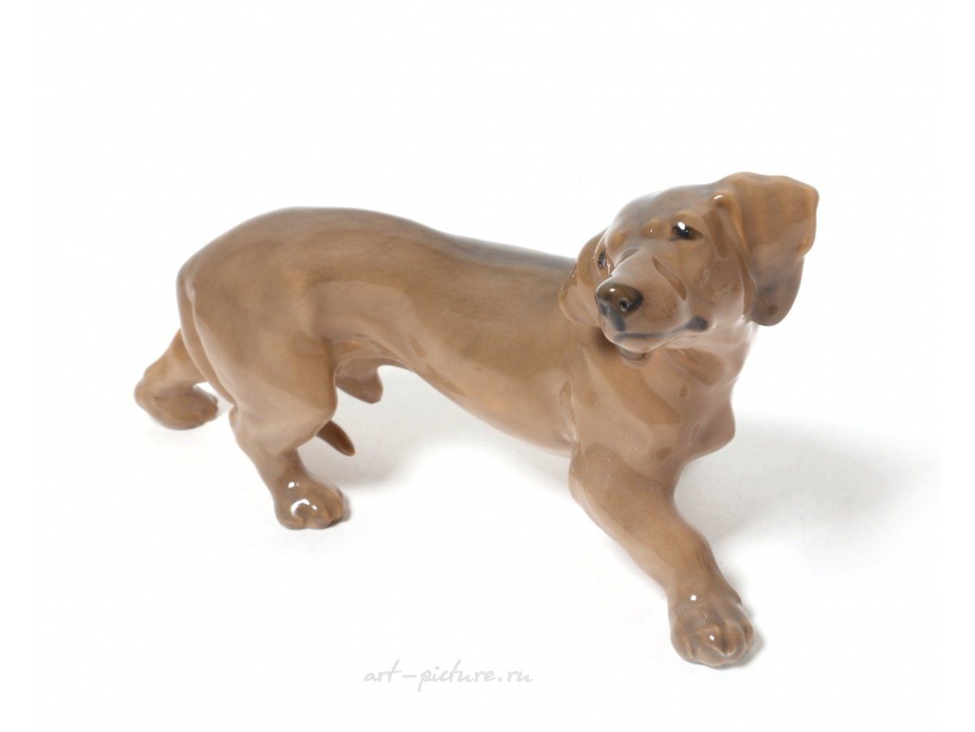 Фарфоровая статуэтка "Такса". Ручная подглазурная роспись. Дания, г. Копенгаген, Royal Copenhagen, 1919 год. Скульптор: Knud Moller. Клеймо производителя. Дизайн раскраски - 1238. Номер модели - 1450, производится с 1913 года. "168" - порядковый номер художника H. Henrichsen, расписавшего статуэтку, работал на фабрике с 1912 по 1923 гг. Размер: 11 х 19 см. Статуэтка первого сорта. Без сколов, повреждений и без реставраций. ======================================= Porcelain figurine "Dachshund". Hand-painted underglaz. Denmark, Copenhagen, Royal Copenhagen, 1919. Sculptor: Knud Moller. Factory mark. Coloring design - 1238. Model - 1450, produced since 1913. "168" - the number of the artist H. Henrichsen, painted this figurine, worked at the factory since 1912 to 1923. Size: 11 х 19 cm. Figurine of the first sort. Without chips, damage and restorations. Royal Copenhagen 1450 (RC_1450)