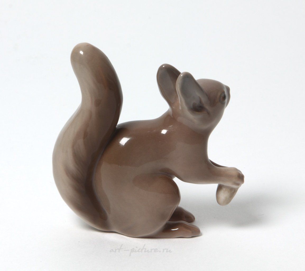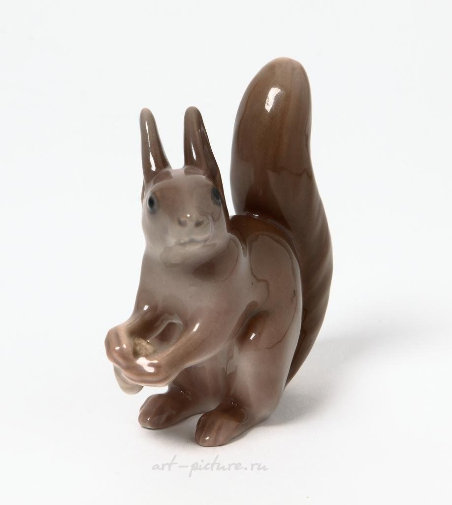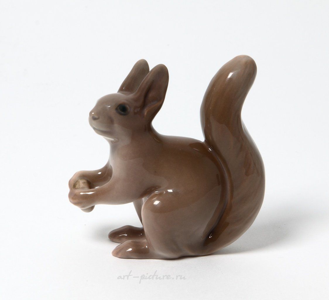 На изображении представлена фарфоровая статуэтка, изображающая белку. Этот предмет демонстрирует высокое качество исполнения и характерные черты фарфора, производимого на знаменитой датской фабрике Bing & Grondahl, основанной в 1853 году в Копенгагене. Фабрика изначально специализировалась на производстве фарфоровой посуды и фигурок, используя традиционные технологии, но с уникальным художественным подходом.