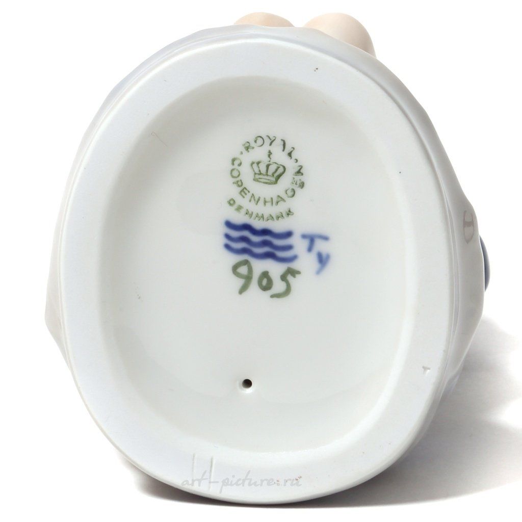 Дания, г. Копенгаген, Royal Copenhagen, 1975-1979 гг. Скульптор: Chr. Thomsen (годы жизни 1860 - 1921 гг, годы работы на фабрике: 1898-1920 гг). Клеймо производителя. Номер модели - 905, производится с 1908 года. Инициалы художника, расписавшего статуэтку: TY.