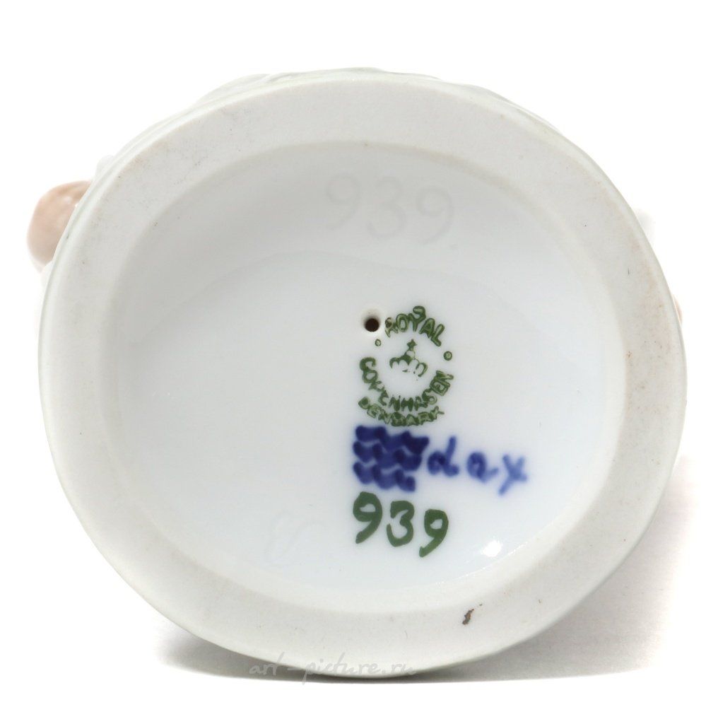 Дания, г. Копенгаген, Royal Copenhagen, 1937 год. Скульптор: Chr. Thomsen (годы жизни 1860 - 1921 гг, годы работы на фабрике: 1898-1920 гг). Клеймо производителя. Номер модели - 939, производится с 1905 года. Инициалы художника, расписавшего статуэтку: dax.
