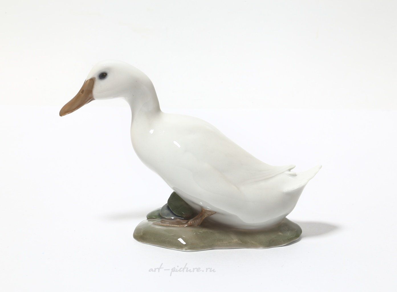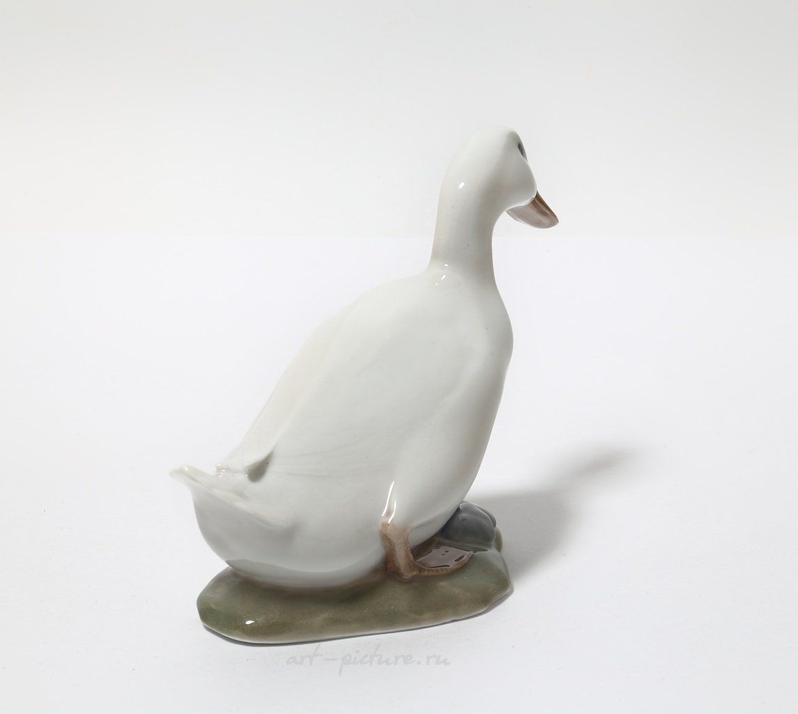 Основные визуальные характеристики статуэтки — белый корпус утки с мягкими тенями, обыгрывающими реалистичность её облика, и аккуратный бежево-коричневый цвет клюва и лап. Эти тонкие нюансы делают фигурку провокационной с точки зрения естественности изображенной птицы, что является значимой особенностью для скульптур, выполненных мануфактурой такого уровня. Статус Royal Copenhagen как производителя искусной керамики и фарфора неизменно привлекал внимание коллекционеров и ценителей искусства.
