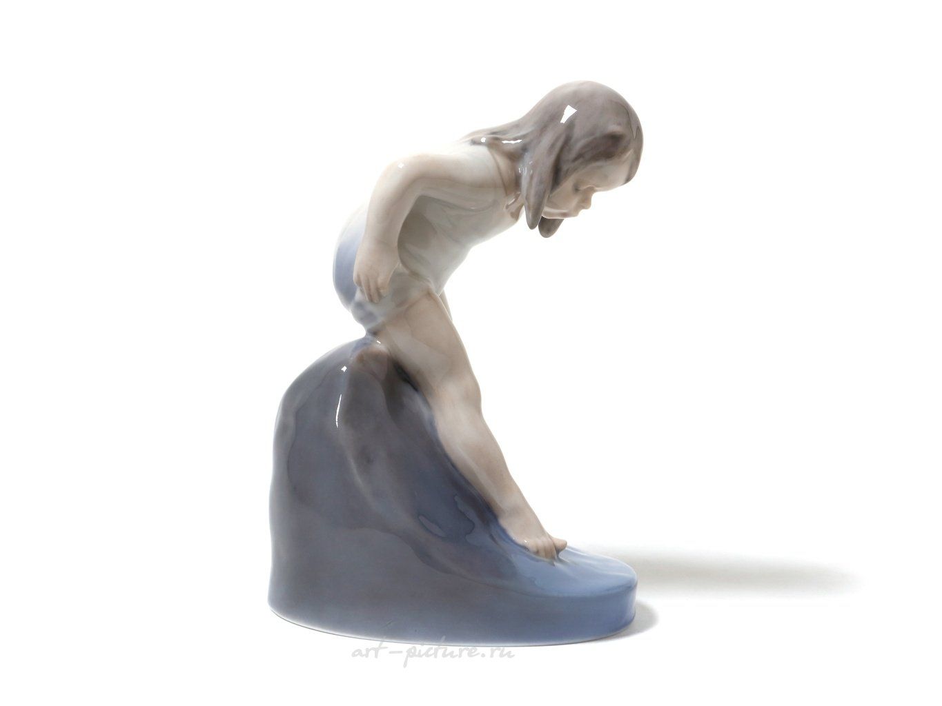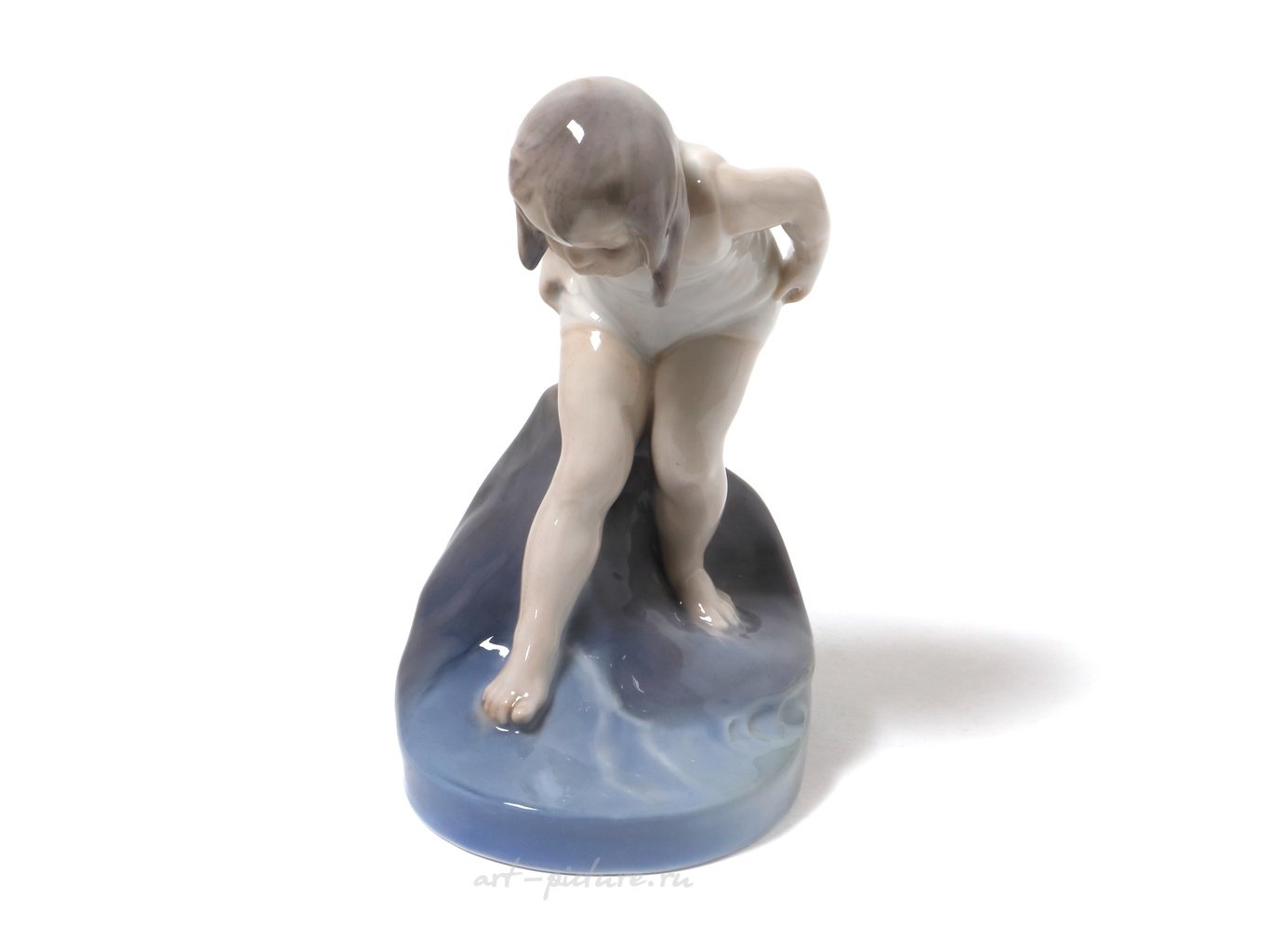 Девочка в фарфоре будто бы поймана в момент легкого любопытства! Она наклонилась вперёд, как будто собирается попробовать эту «воду». И это удивительное движение вызывает у меня ощущение радости, свободы и беззаботности! Она стоит одной ногой на подставке, а вторая нога поднята, и это придаёт ей такую оригинальность и игривость! Мне кажется, что каждый из нас, глядя на неё, может вспомнить те моменты, когда мы смело пробовали что-то новое, как, например, плавание в море или исследование какого-то таинственного уголка парка!