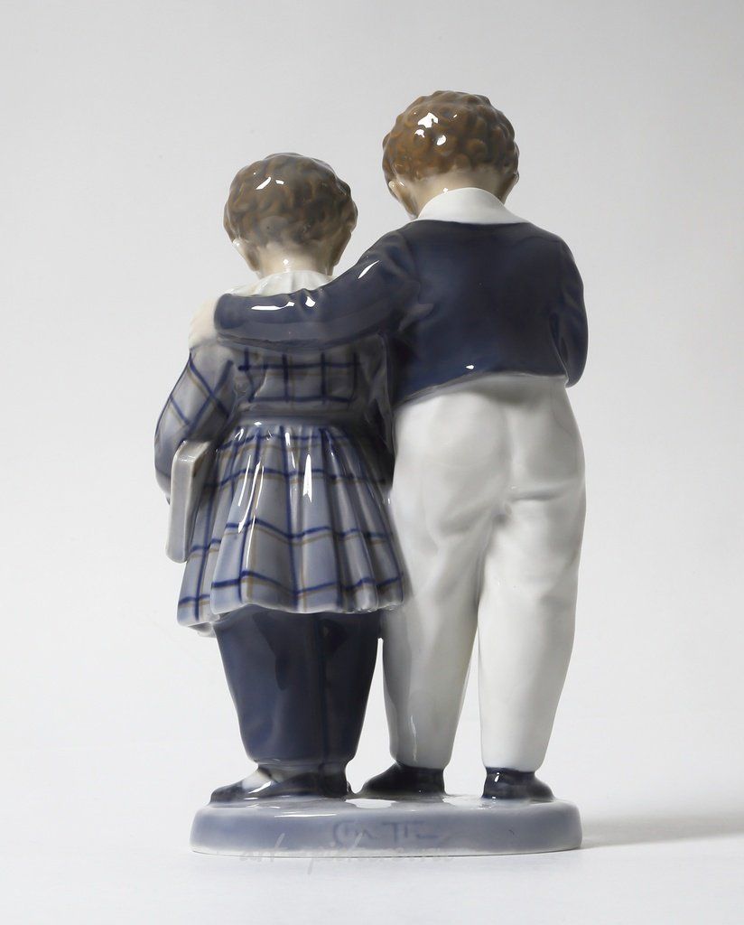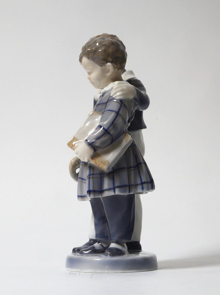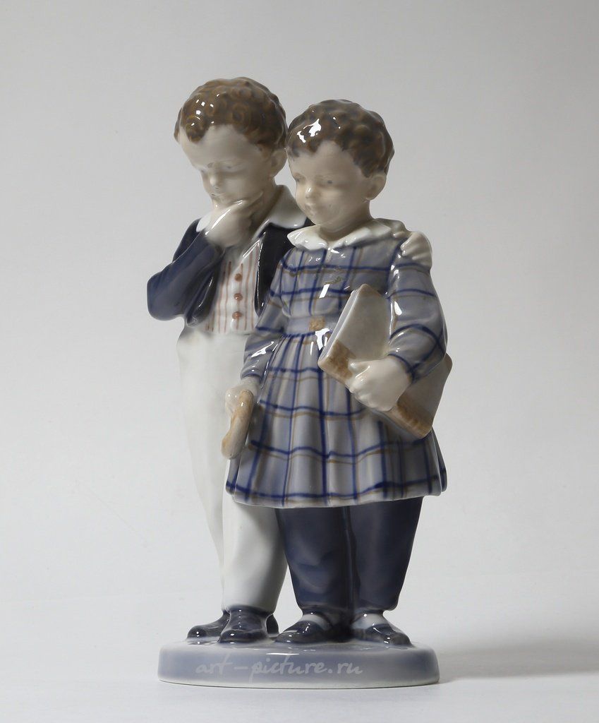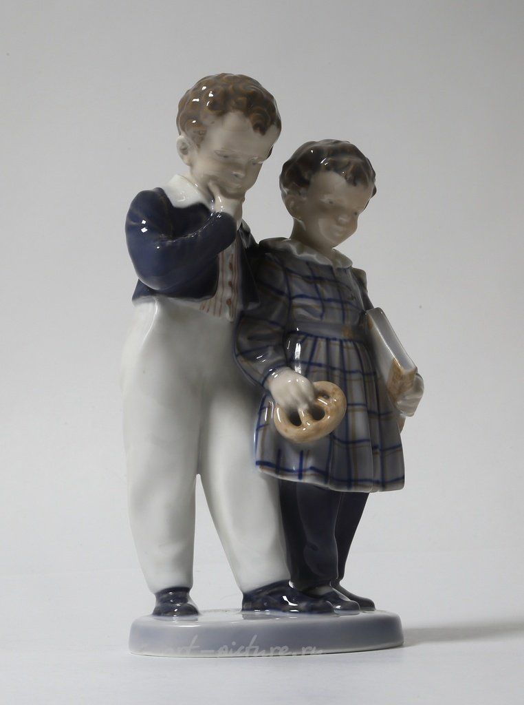 Предмет: Это фарфоровая статуэтка, изображающая двух детей. Мальчик слева, в темно-синим пиджаке и белых брюках, и девочка справа с книгой и кренделем демонстрируют традиционный подход к изображению детской невинности. Данный объект является статуэткой, поскольку в первую очередь представляет собой художественное произведение, предназначенное для декоративного использования, а не функционального.