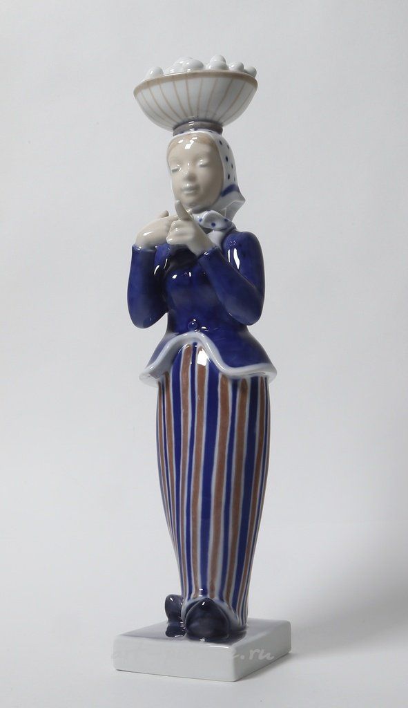 Давайте обратим внимание на фарфоровую статуэтку "Женщина с корзиной яиц на голове" от Royal Copenhagen. Это произведение поражает своим изяществом и качеством исполнения, что делает его ярким примером датского фактического искусства. Статуэтка выполнена с большой внимательностью к деталям — как всего образа, так и мелочей, которые в совокупности создают общее впечатление.