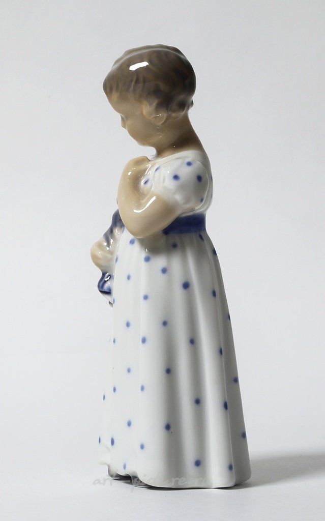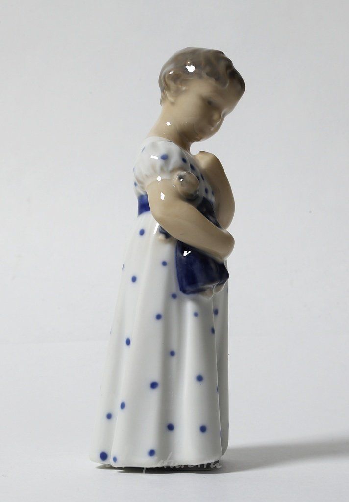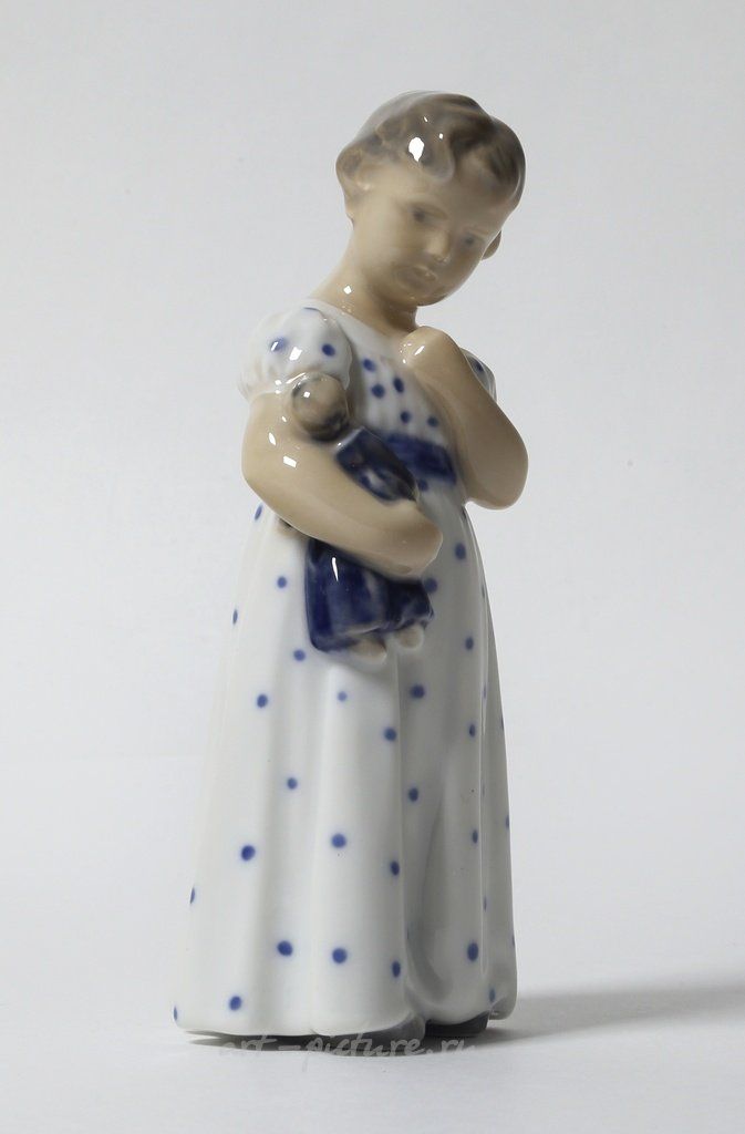 Фарфоровая фигура (статуэтка) "Девочка с куклой". Ручная подглазурная роспись. Дания, г. Копенгаген, Royal Copenhagen, 1952 год. Скульптор: Ada Bonfils. Клеймо производителя. Номер модели - 1938, производится с 1918 года. Инициалы художника, расписавшего статуэтку: hvx. Высота - 13 см. Статуэтка первого сорта. Без сколов, повреждений и без реставраций. Porcelain figurine "Girl with doll". Hand-painted underglaz. Denmark, Copenhagen, Royal Copenhagen, year 1952. Sculptor: Ada Bonfils. Factory mark. Model - 1938, produced since 1918. The initials of the artist painted this figurine: hvx. Height - 13 cm. Figurine of the first sort. Without chips, damage and restorations. RC_1938 Люди Дети