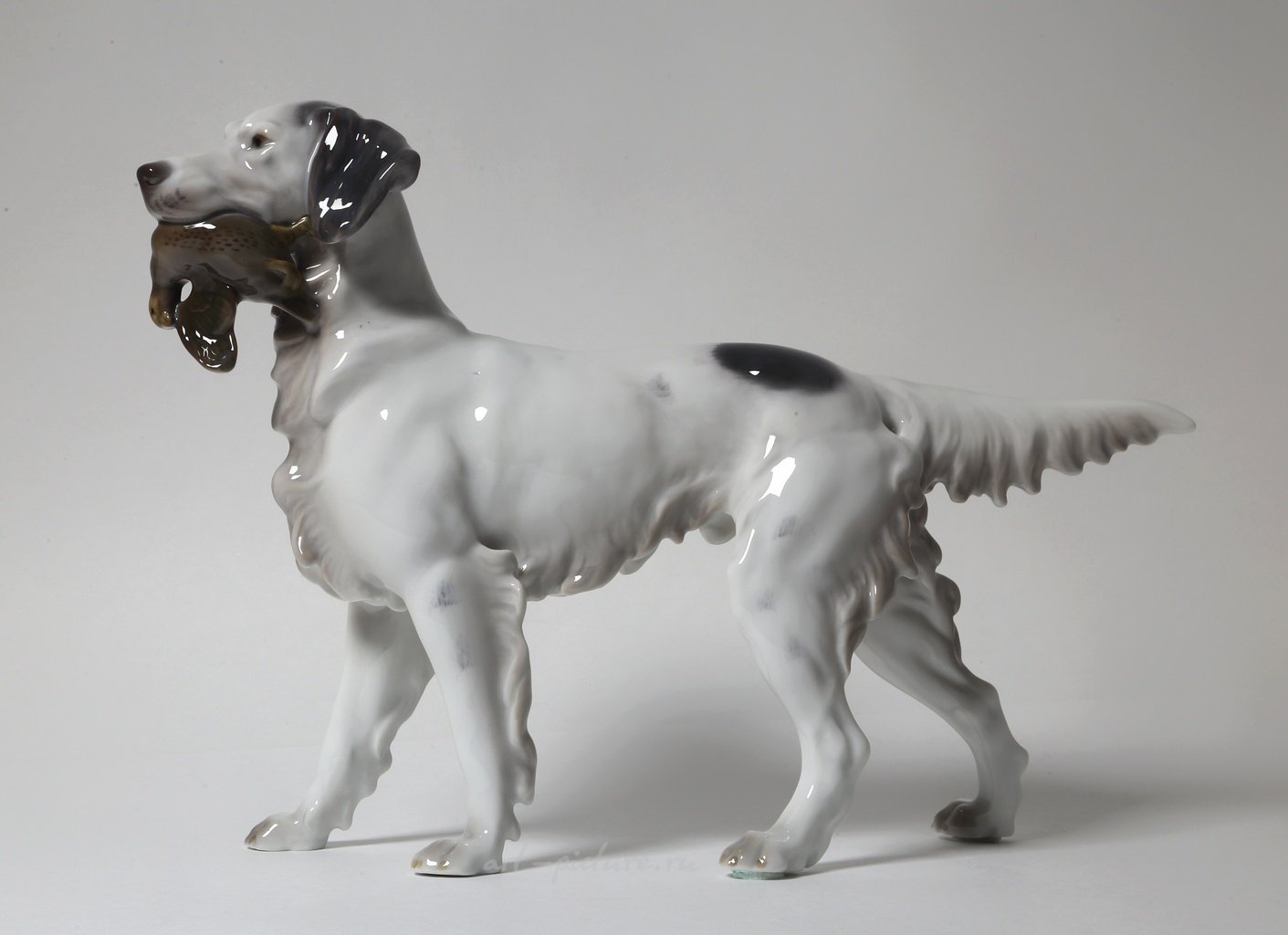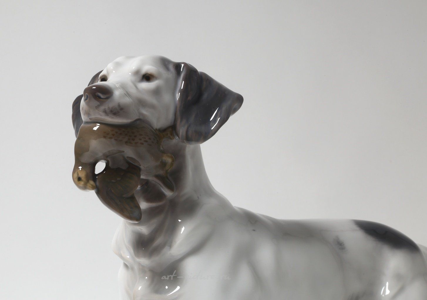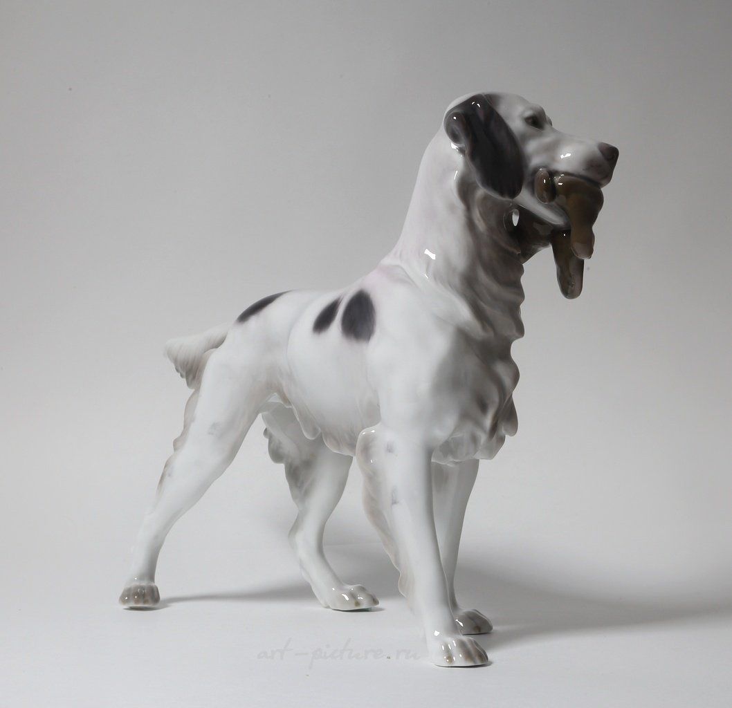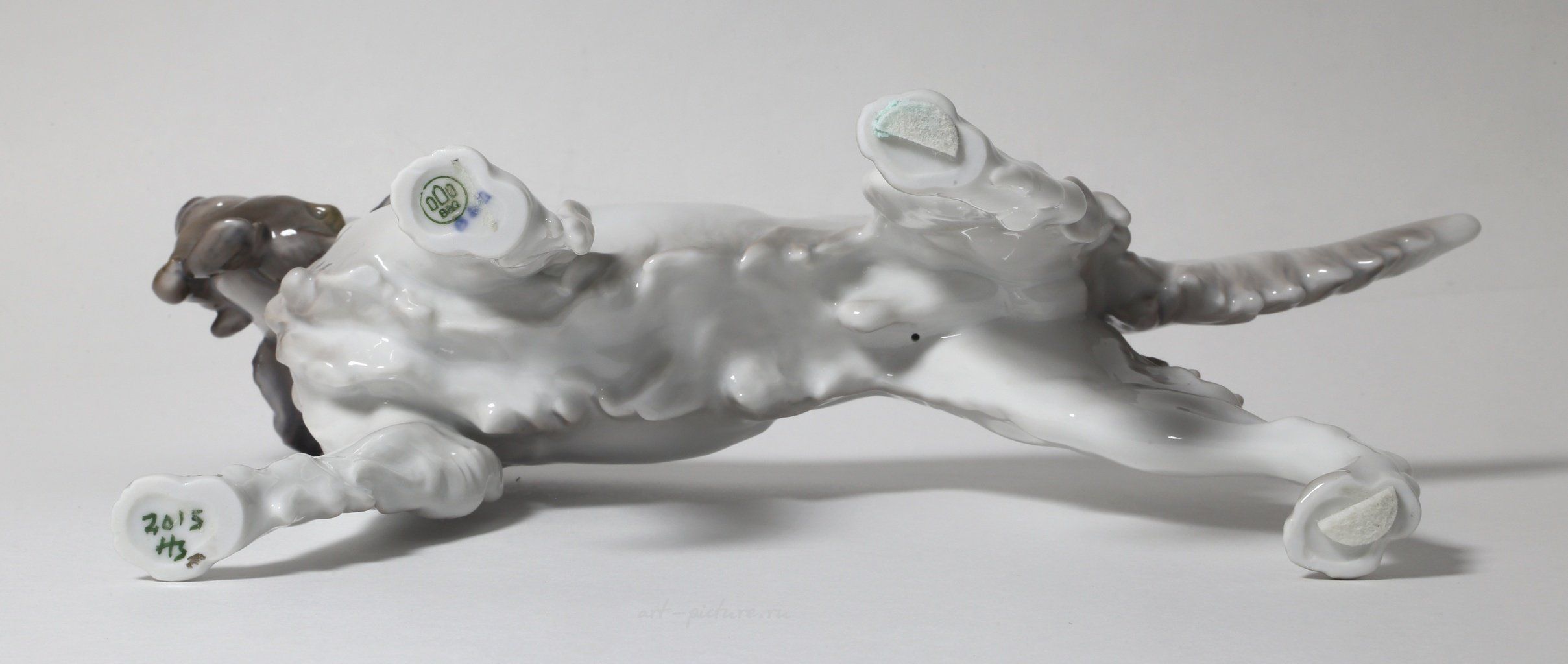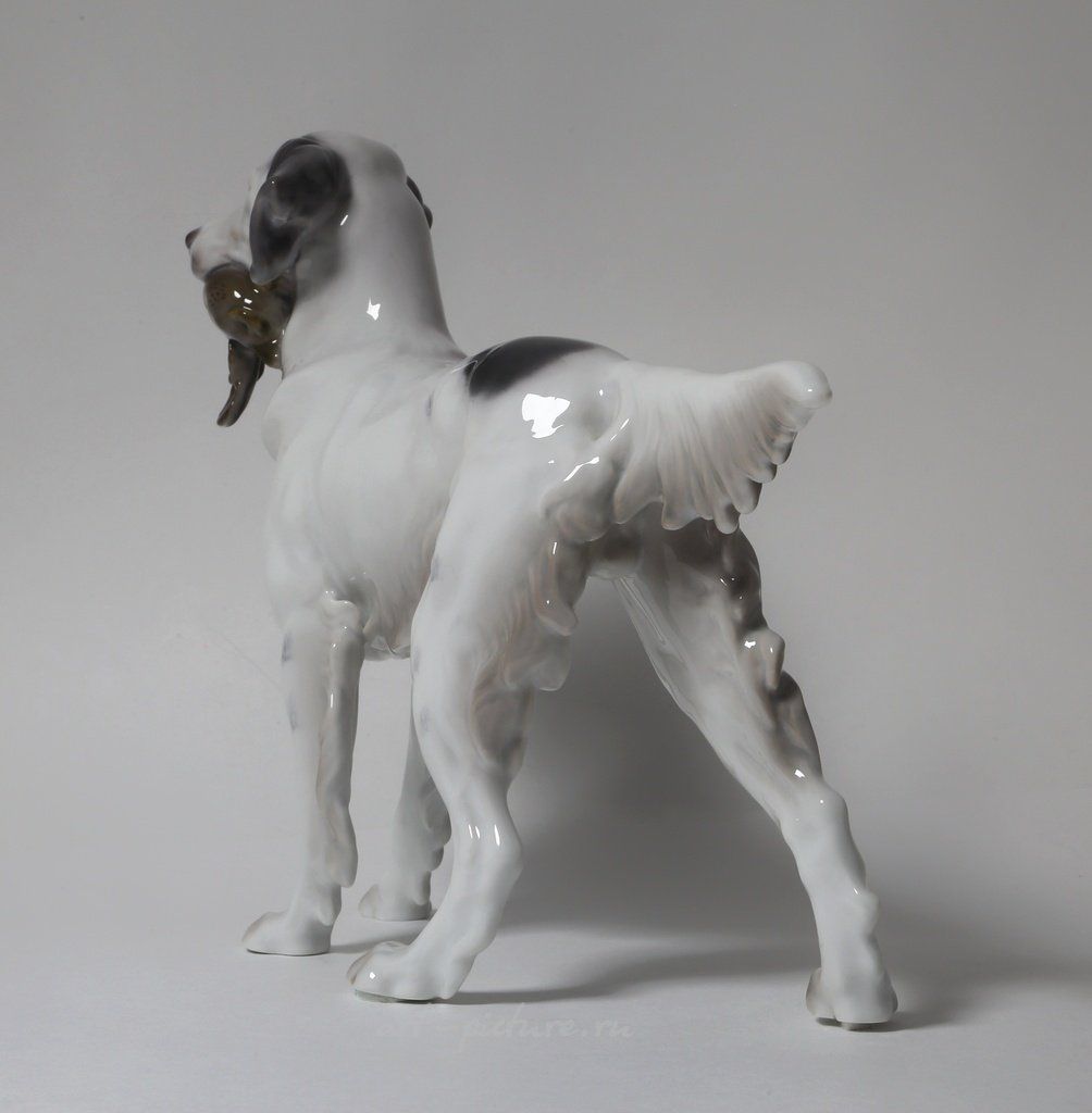 Фарфоровая статуэтка "Сеттер с куропаткой". Ручная подглазурная роспись. Дания, г. Копенгаген, Bing & Grondahl. Скульптор: Laurits Jensen. Клеймо производителя: 3 towers B&G Copenhagen Porcelain Made in Denmark, 1970-1983 гг. Номер модели - 2015. Инициалы художника, расписавшего статуэтку Размер 22 х 31 см. Статуэтка первого сорта. Без сколов, повреждений и без реставраций. Porcelain figurine "Setter with bird". Hand-painted underglaz. Denmark, Copenhagen, Bing & Grondahl. Sculptor: Laurits Jensen. Factory mark: 3 towers B&G Copenhagen Porcelain Made in Denmark, 1970-1983. Model - 2015. The initials of the artist painted this figurine Size 22 х 31 cm. Figurine of the first sort. Without chips, damage and restorations. Bing & Grondahl 2015 (BG_2015) Собака