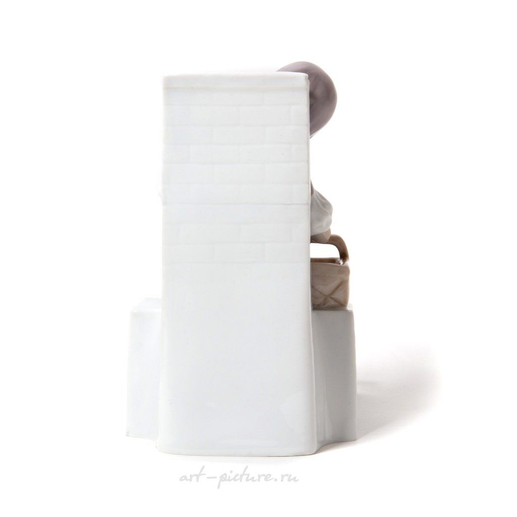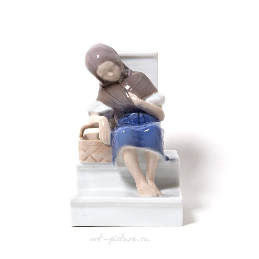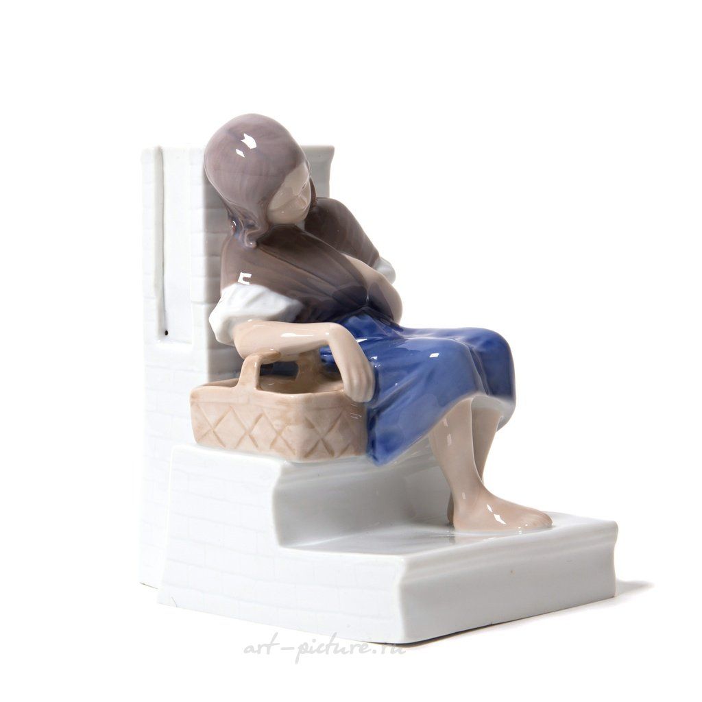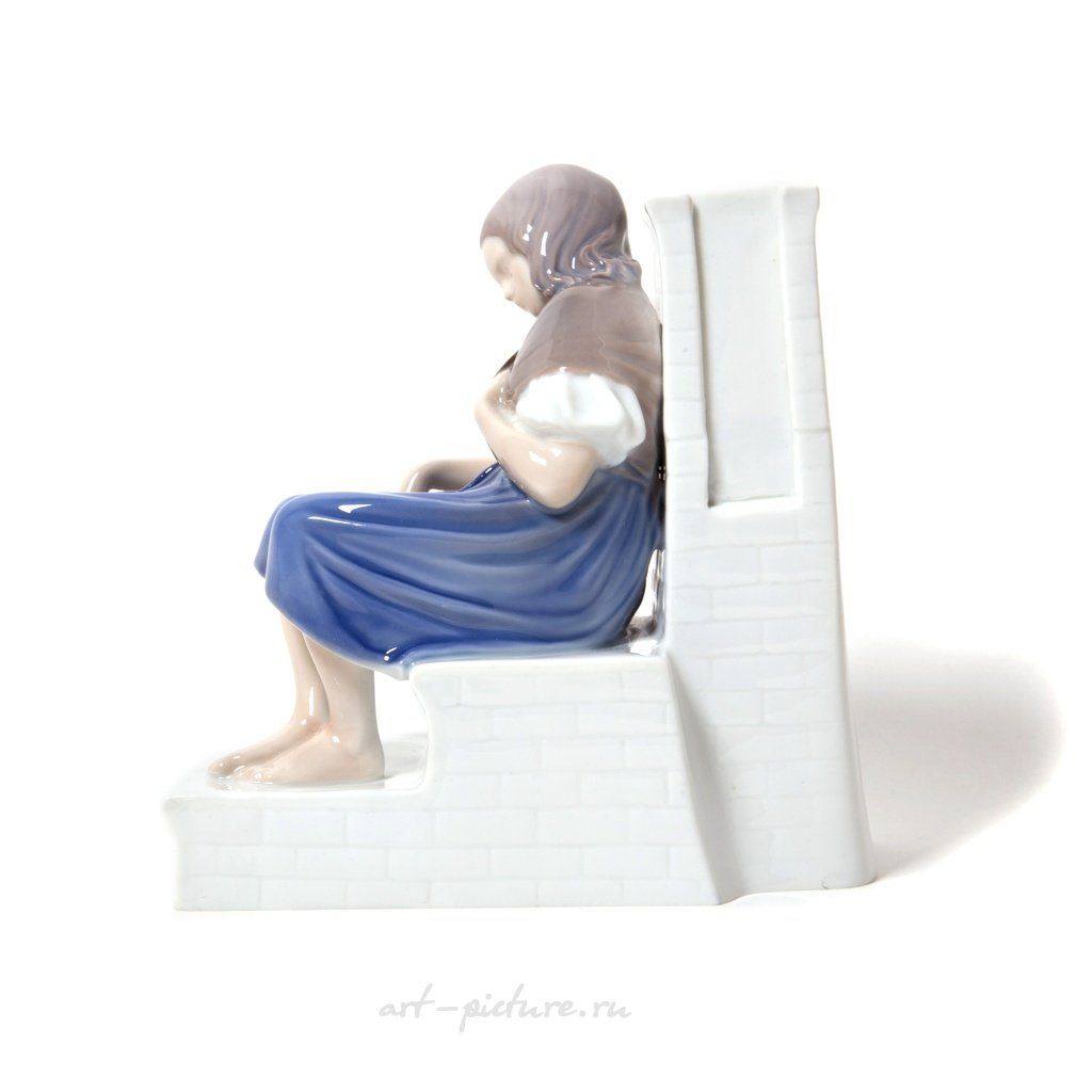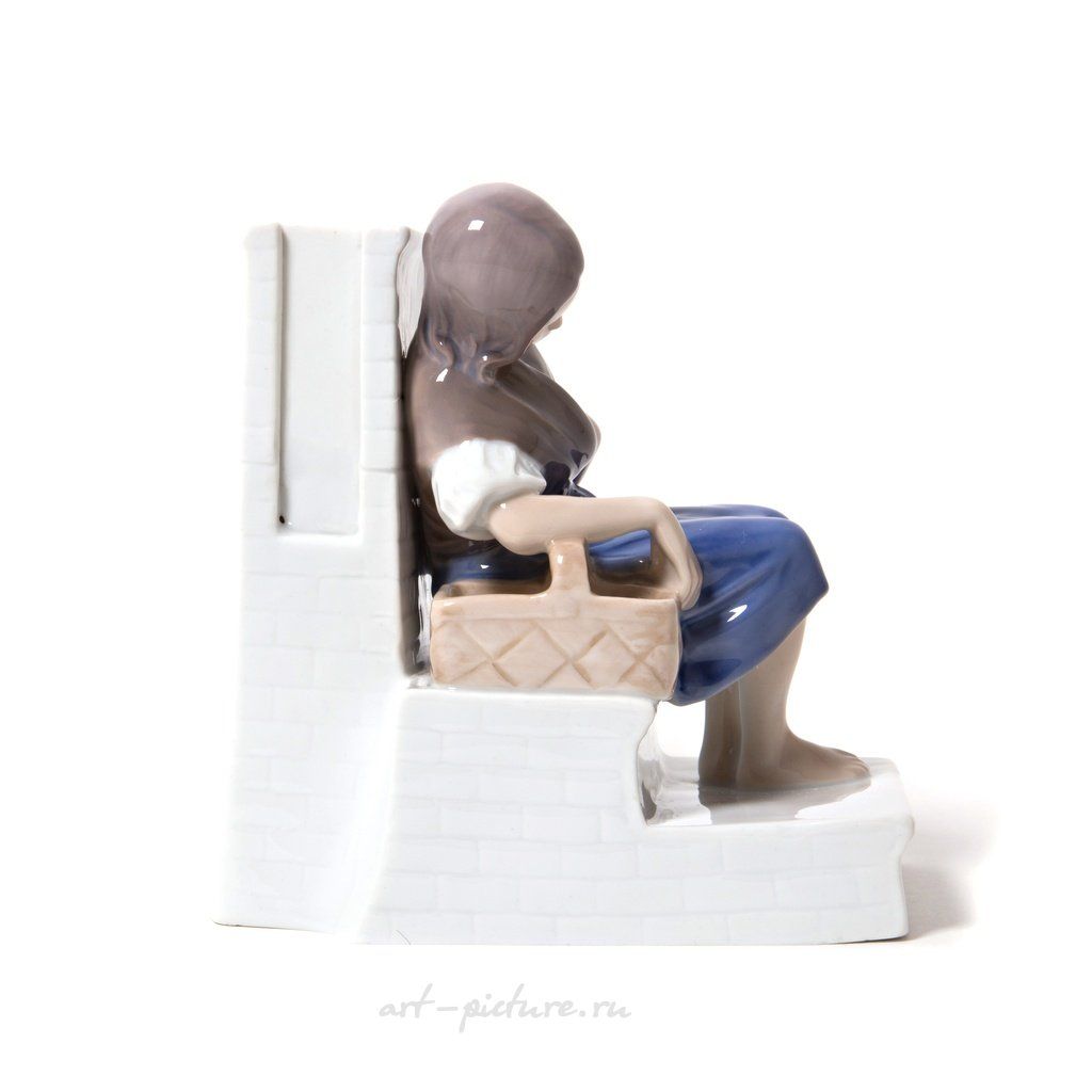 Статуэтка выполнена с потрясающей тщательностью! Эти плавные линии и приглушенные цвета, которые прекрасно гармонируют друг с другом, подчеркивают выразительность работы, которую мы можем наблюдать у Bing & Grondahl. Каждый элемент детализирован до мелочей: посмотрите на её руки! Одна с корзинкой, столь аккуратно размещенной на ступенях, а другая, тихо покоящаяся на коленях, словно подчеркивает её бесконечную задумчивость. И в этом есть что-то очень человечное и близкое!