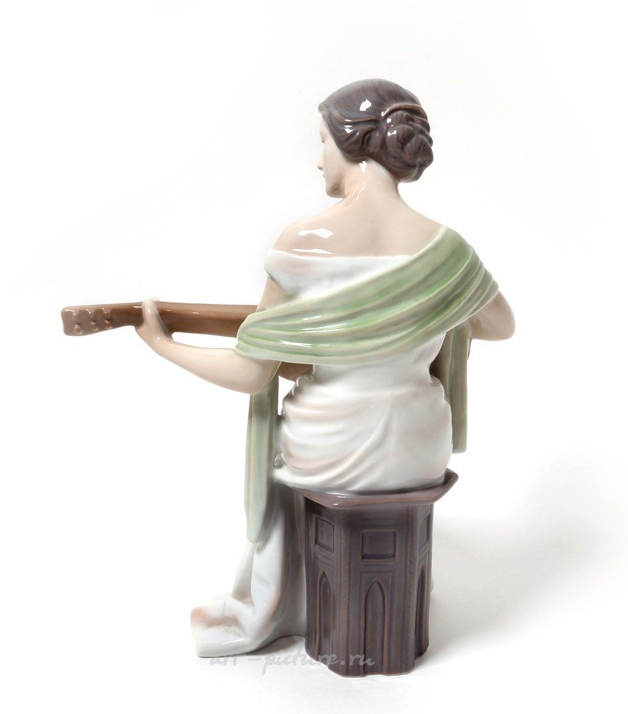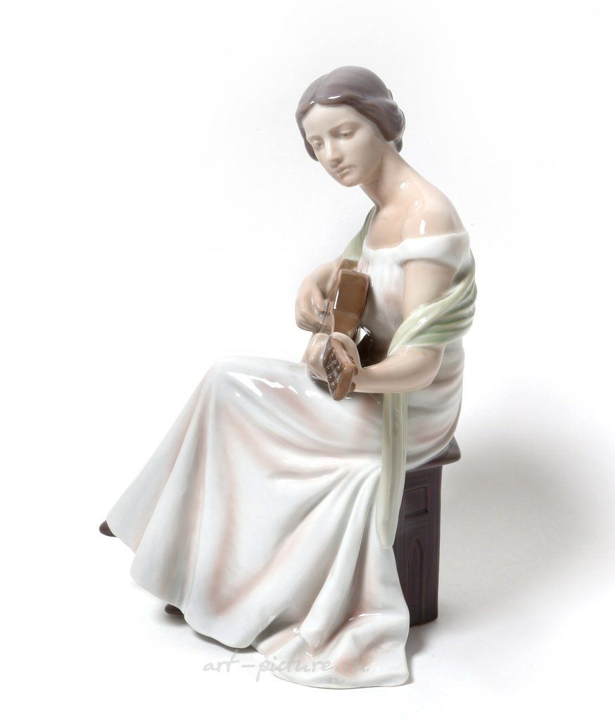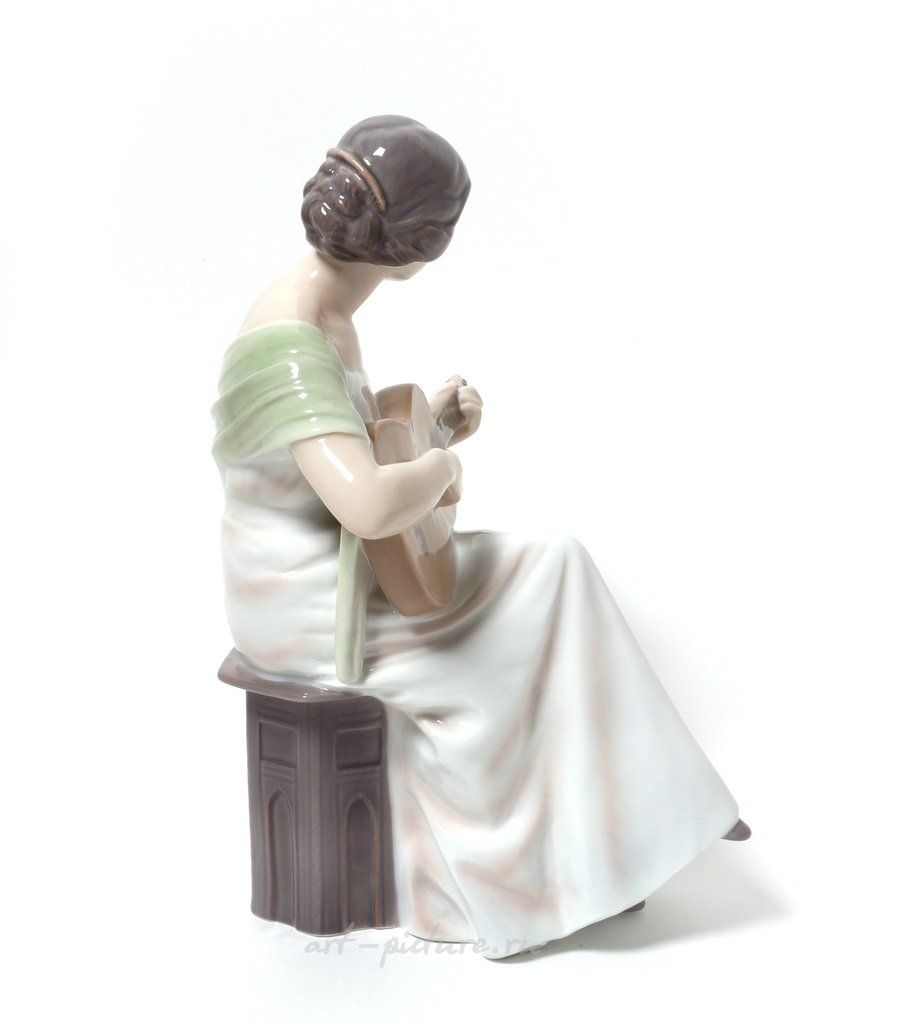 Фарфоровая статуэтка "Девушка с гитарой". Ручная подглазурная роспись. Дания, г. Копенгаген, Bing & Grondahl. Скульптор: Ingeborg Plockross Irminger. Клеймо производителя: B&G Kjobenhavn Denmark, 1962-1970 гг. Номер модели - 1684. Инициалы художника, расписавшего статуэтку: T. Высота - 24,5 см. Статуэтка первого сорта. Без сколов, повреждений и без реставраций.
