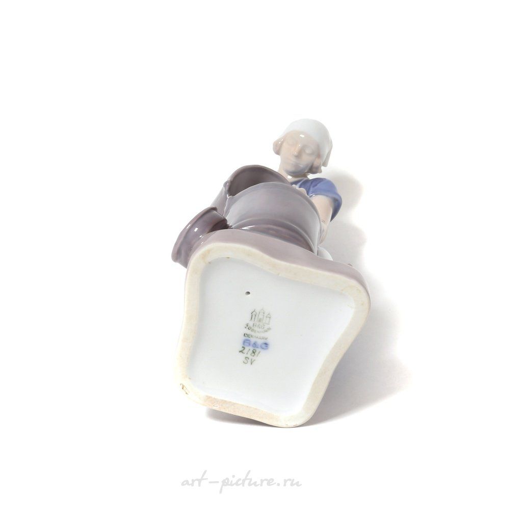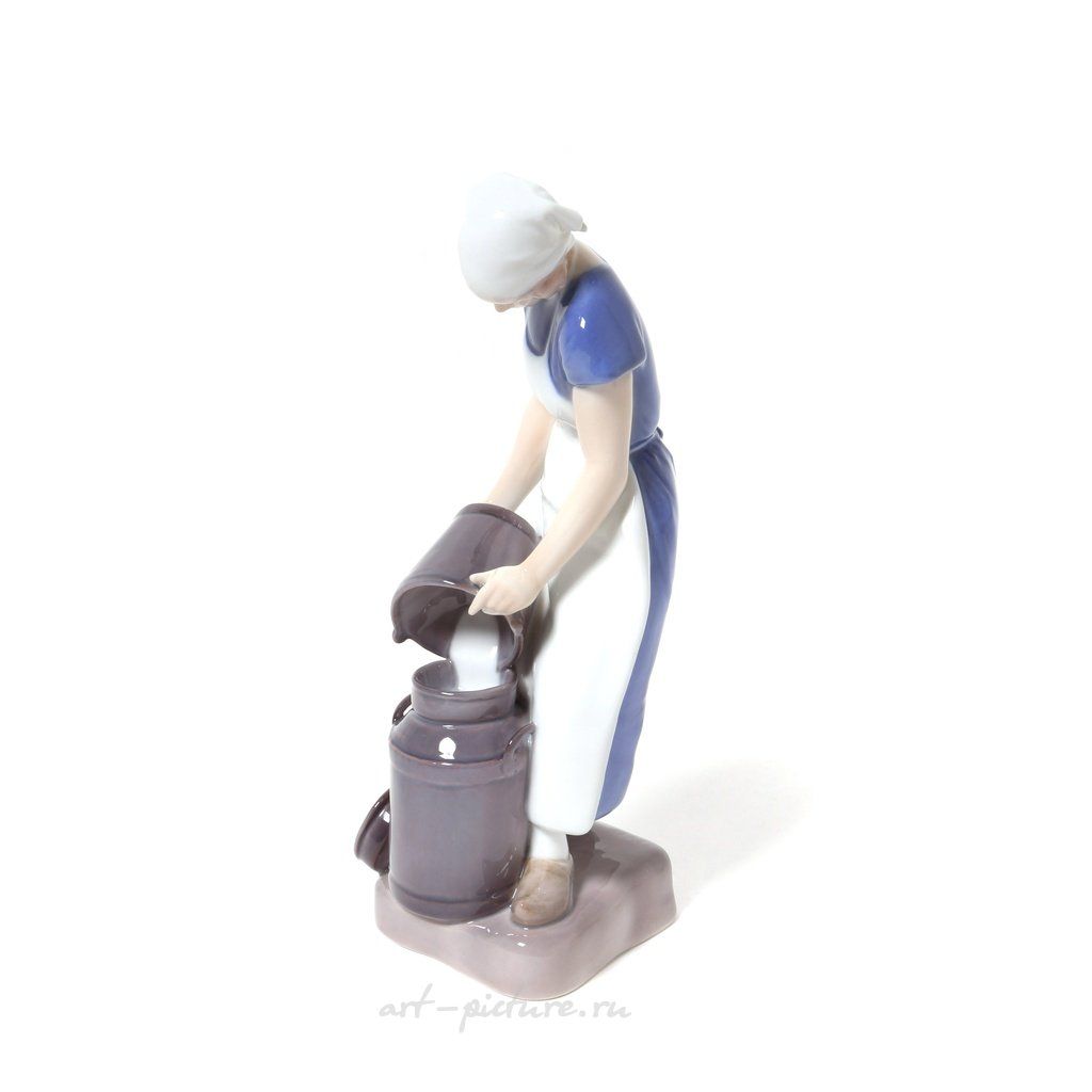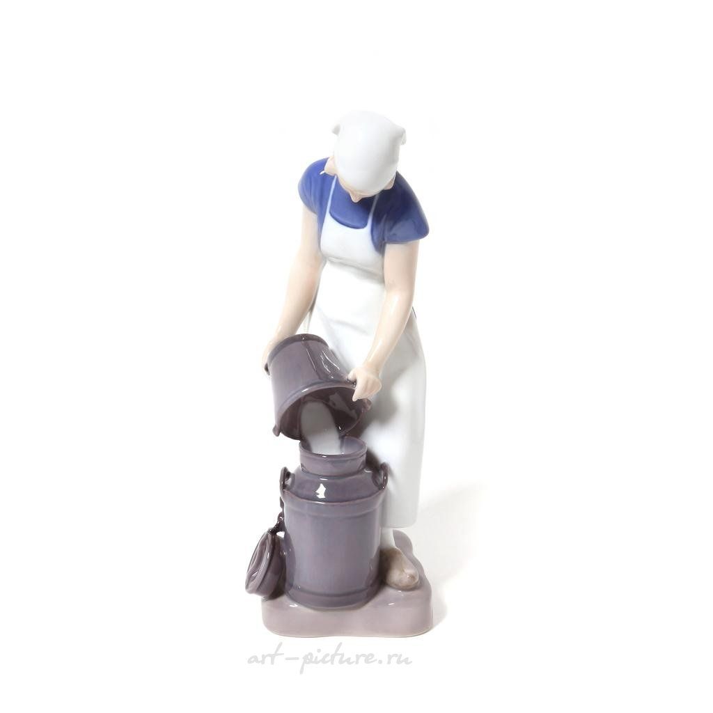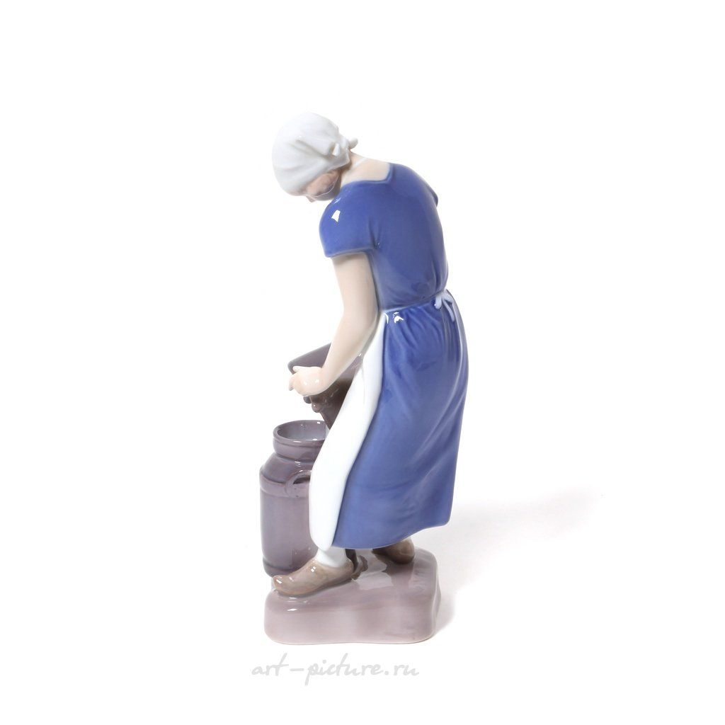 Фарфоровая фигура (статуэтка) "Девушка, переливающая молоко". Ручная подглазурная роспись. Дания, г. Копенгаген, Bing & Grondahl. Скульптор: Axel Locher. Клеймо производителя: B&G Kjobenhavn Denmark, 1962-1970 гг. Номер модели - 2181. Инициалы художника, расписавшего статуэтку: SV. Высота - 21.5 см. Статуэтка первого сорта. Без сколов, повреждений и без реставраций. Porcelain figurine "Girl with milkan". Hand-painted underglaz. Denmark, Copenhagen, Bing & Grondahl. Sculptor: Axel Locher. Factory mark: B&G Kjobenhavn Denmark, the 1962-1970. Model - 2181. The initials of the artist painted this figurine: SV. Height - 21.5 cm. Figurine of the first sort. Without chips, damage and restorations. BG_2181 Люди