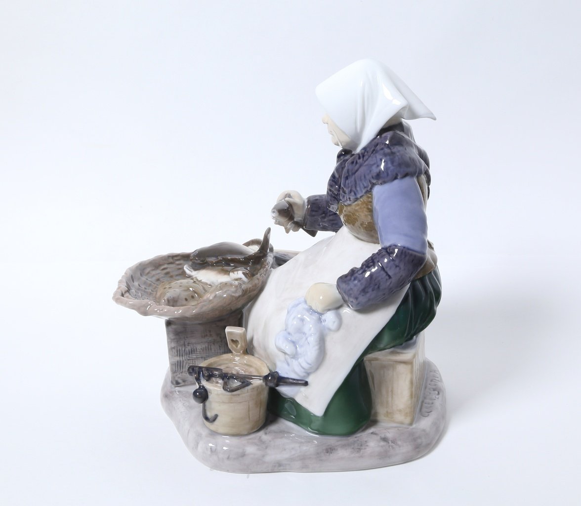 На данный момент у нас имеется возможность обсуждать фарфоровую статуэтку, изображающую пожилую женщину, занимающуюся обработкой рыбы. Эта работа, выполненная на высоком уровне мастерами фабрики Bing & Grondahl, представляет собой интересный объект для изучения с точки зрения рыночной стоимости, редкости и исторической значимости.