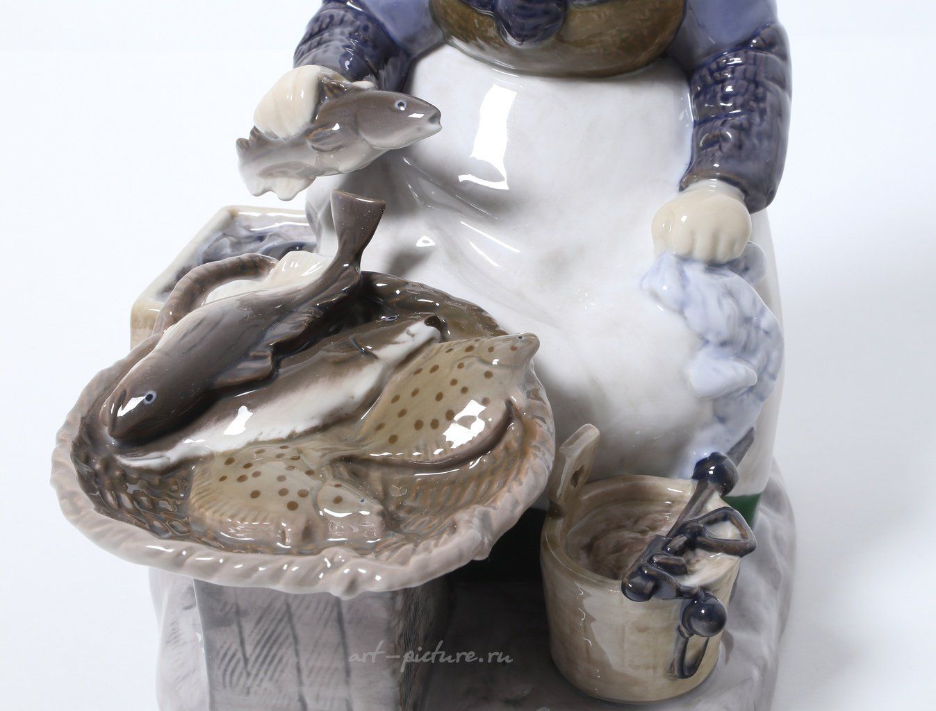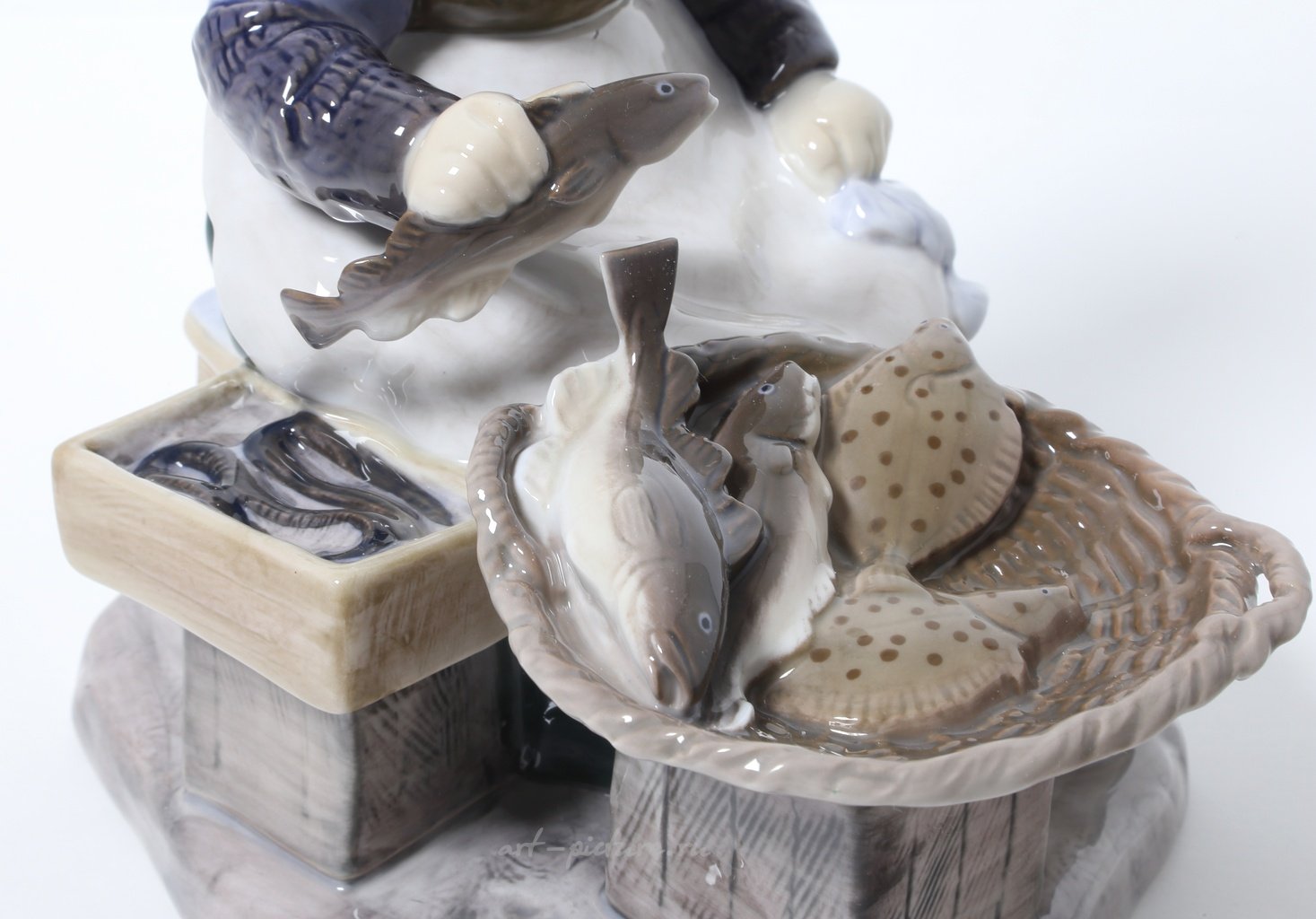 Как вы правильно отметили, одна из самых прекрасных особенностей партнерской работы с фарфором — это высокая степень детализации и мастерства исполнения. Например, статуэтка "Рыбная лавка", исполненная скульптором Axel Locher, действительно демонстрирует великолепное качество росписи и проработки деталей. И это абсолютная правда, что применение глазури придает произведению привлекательный блеск, так как именно эта техника характерна для многих работ Bing & Grondahl.