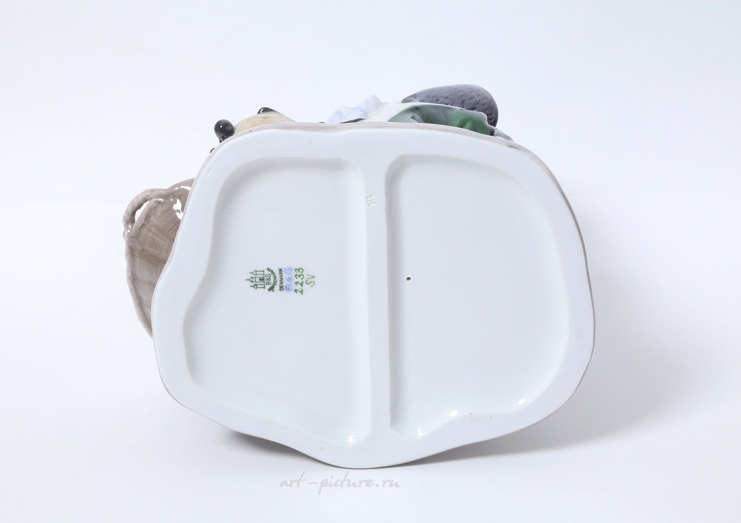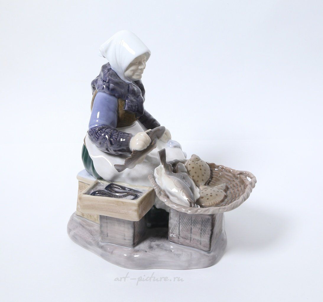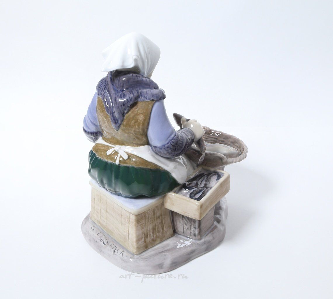 Фарфоровая статуэтка "Рыбная лавка". Ручная подглазурная роспись. Дания, г. Копенгаген, Bing & Grondahl. Скульптор: Axel Locher. Клеймо производителя: B&G Kjobenhavn Denmark, 1962-1970 гг. Номер модели - 2233. Инициалы художника, расписавшего статуэтку: SV. Высота - 20,5 см. Статуэтка первого сорта. Без сколов, повреждений и без реставраций. Porcelain figurine "Fish Market". Hand-painted underglaz. Denmark, Copenhagen, Bing & Grondahl. Sculptor: Axel Locher. Factory mark: B&G Kjobenhavn Denmark, 1962-1970. Model - 2233. The initials of the artist painted this figurine: SV. Height - 20,5 cm. Figurine of the first sort. Without chips, damage and restorations. Bing & Grondahl 2233 (BG_2233)