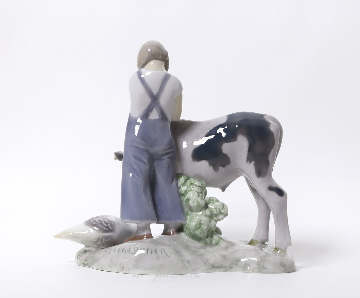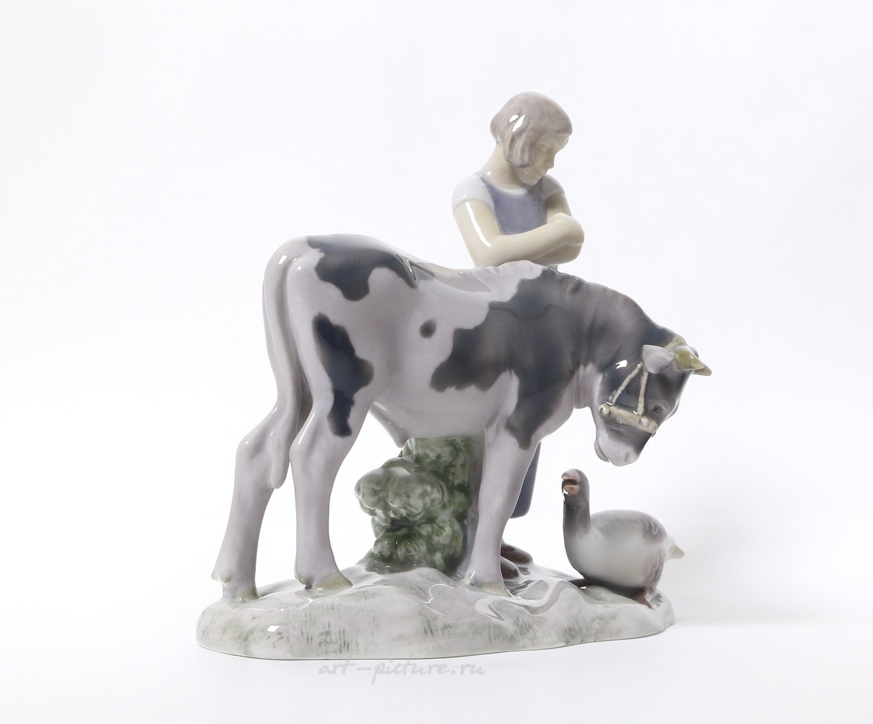 Фарфоровая статуэтка "Девушка с коровой и гусем". Ручная подглазурная роспись. Дания, г. Копенгаген, Bing & Grondahl. Скульптор: Axel Locher. Клеймо производителя: B&G Kjobenhavn DanmarkMade in Denmark, 1958 -1962 гг. Номер модели - 2272. Инициалы художника, расписавшего статуэтку. Высота - 19,5 см. Статуэтка первого сорта. Без сколов, повреждений и без реставраций. Porcelain figurine "Girl with cow & goose". Hand-painted underglaz. Denmark, Copenhagen, Bing & Grondahl. Sculptor: Axel Locher. Factory mark: B&G Kjobenhavn DanmarkMade in Denmark, 1958 -1962. Model - 2272. The initials of the artist painted this figurine. Height - 19.5 cm. Figurine of the first sort. Without chips, damage and restorations. Bing & Grondahl 2272 (BG_2272)
