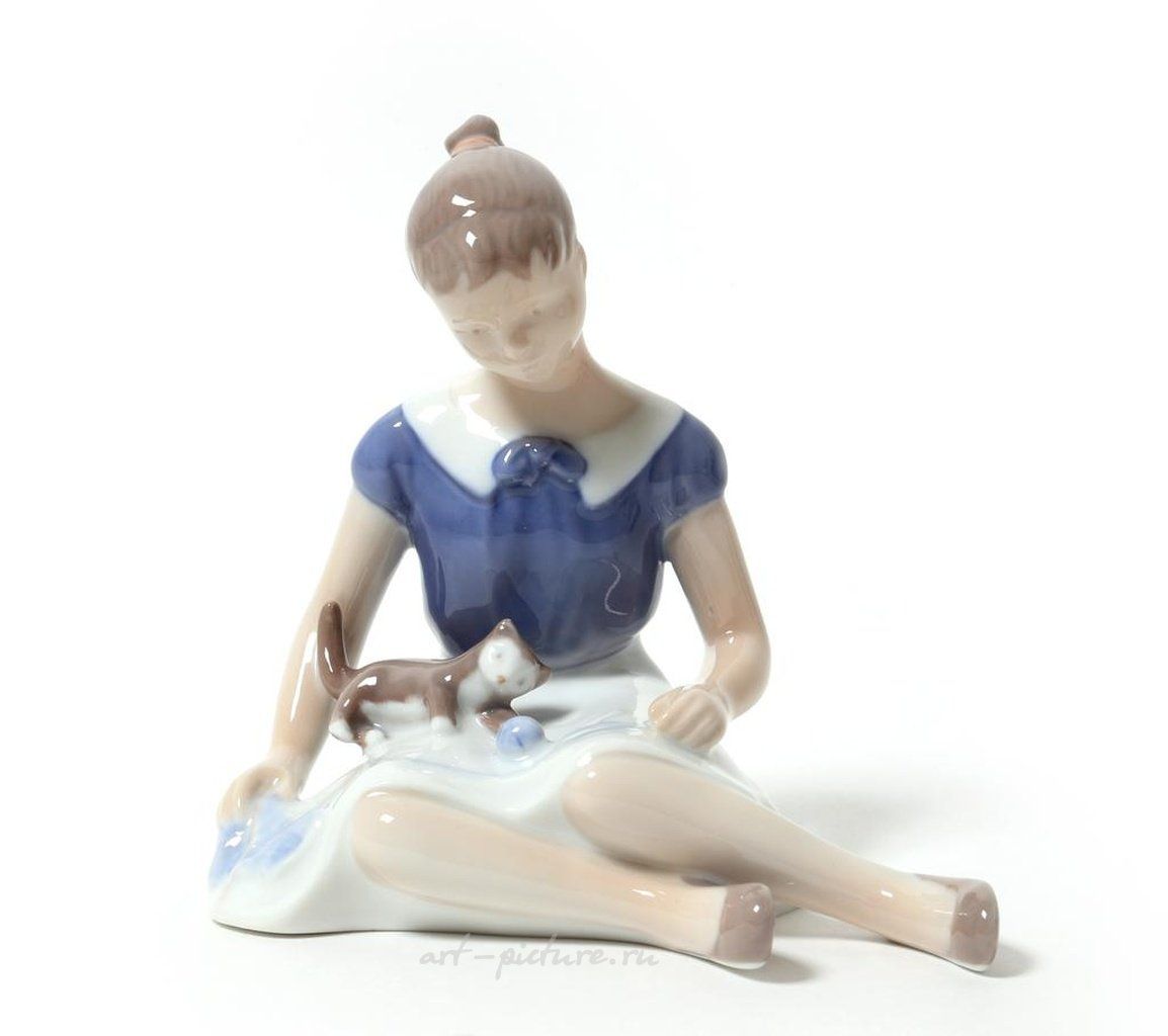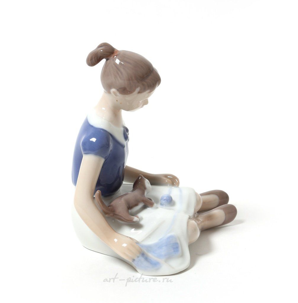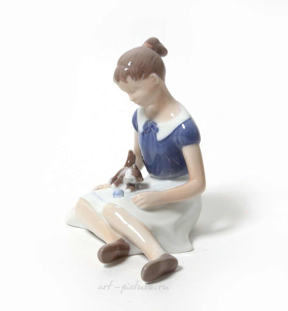 Фарфоровая фигура (статуэтка) "Бриджит. Девочка с кошкой". Ручная подглазурная роспись. Дания, г. Копенгаген, Bing & Grondahl. Скульптор: Vita Thymann. Клеймо производителя: 3 towers B&G Copenhagen Porcelain Made in Denmark, 1970-1983 гг. Номер модели - 2329. Инициалы художника, расписавшего статуэтку: J. Высота - 11,5 см. Статуэтка первого сорта. Без сколов, повреждений и реставраций. Porcelain figurine "Birgite. Girl with cat". Hand-painted underglaz. Denmark, Copenhagen, Bing & Grondahl. Sculptor: Vita Thymann. Factory mark: 3 towers B&G Copenhagen Porcelain Made in Denmark, the 1970-1983. Model - 2329. The initials of the artist painted this figurine: J. Height - 11,5 cm. Figurine of the first sort. Without chips, damage and restorations. BG_2329 Люди Дети