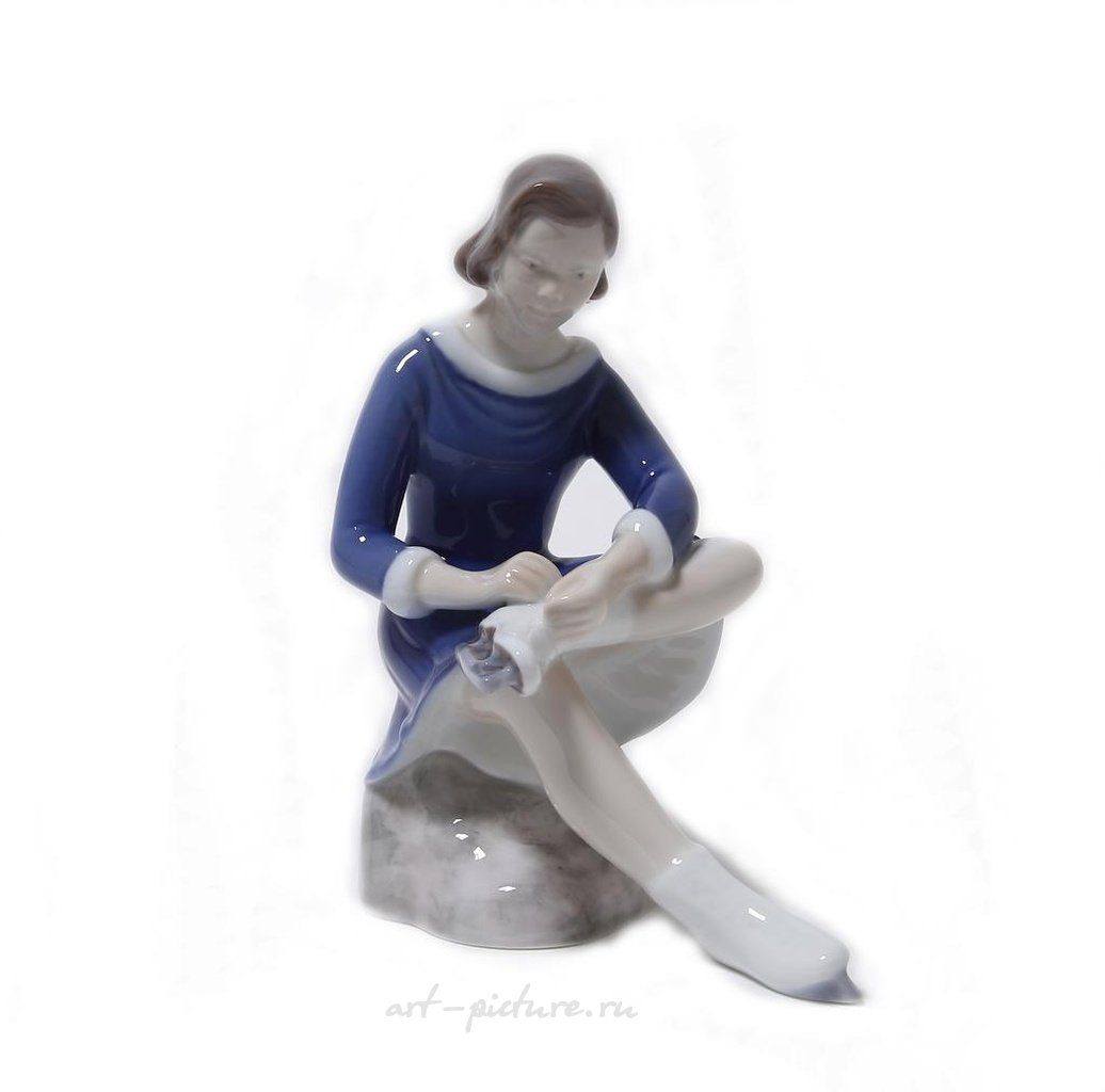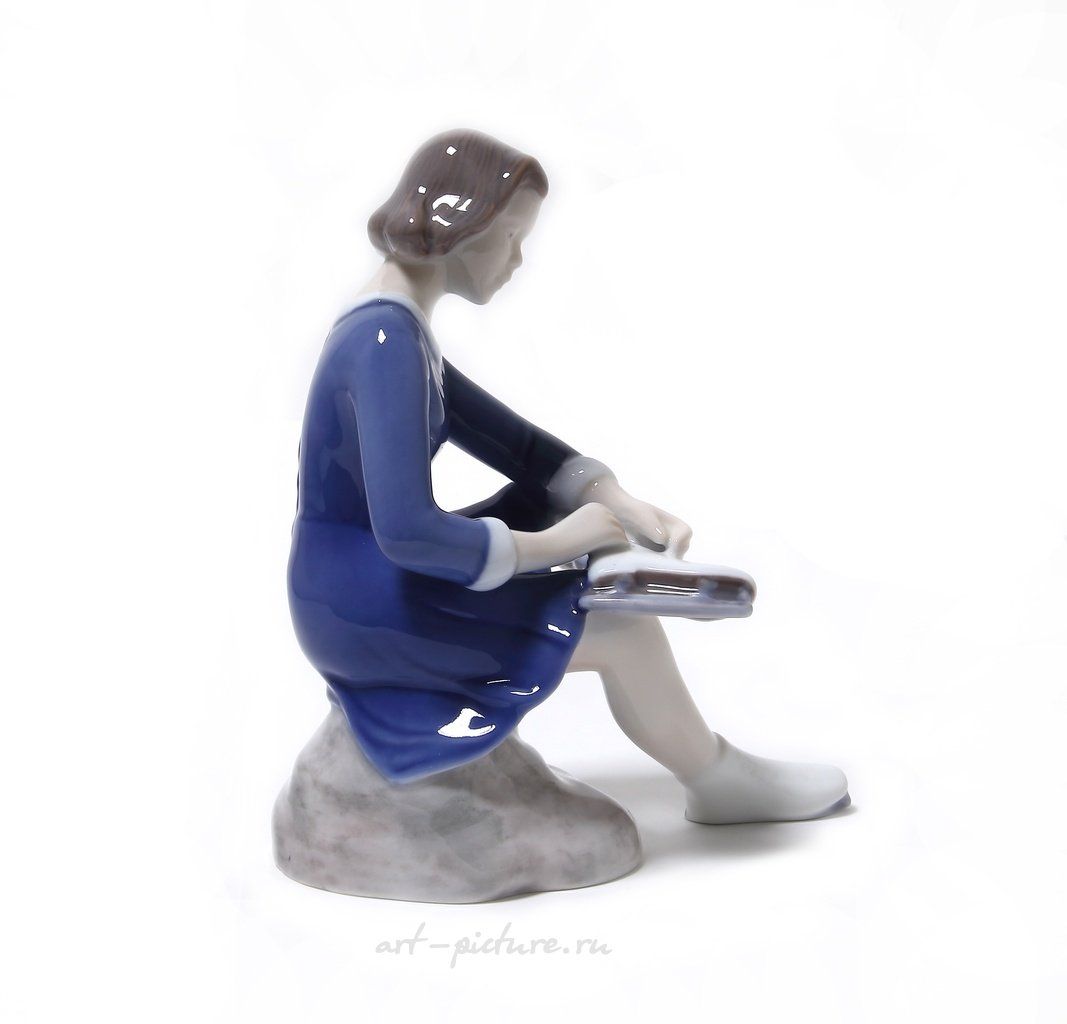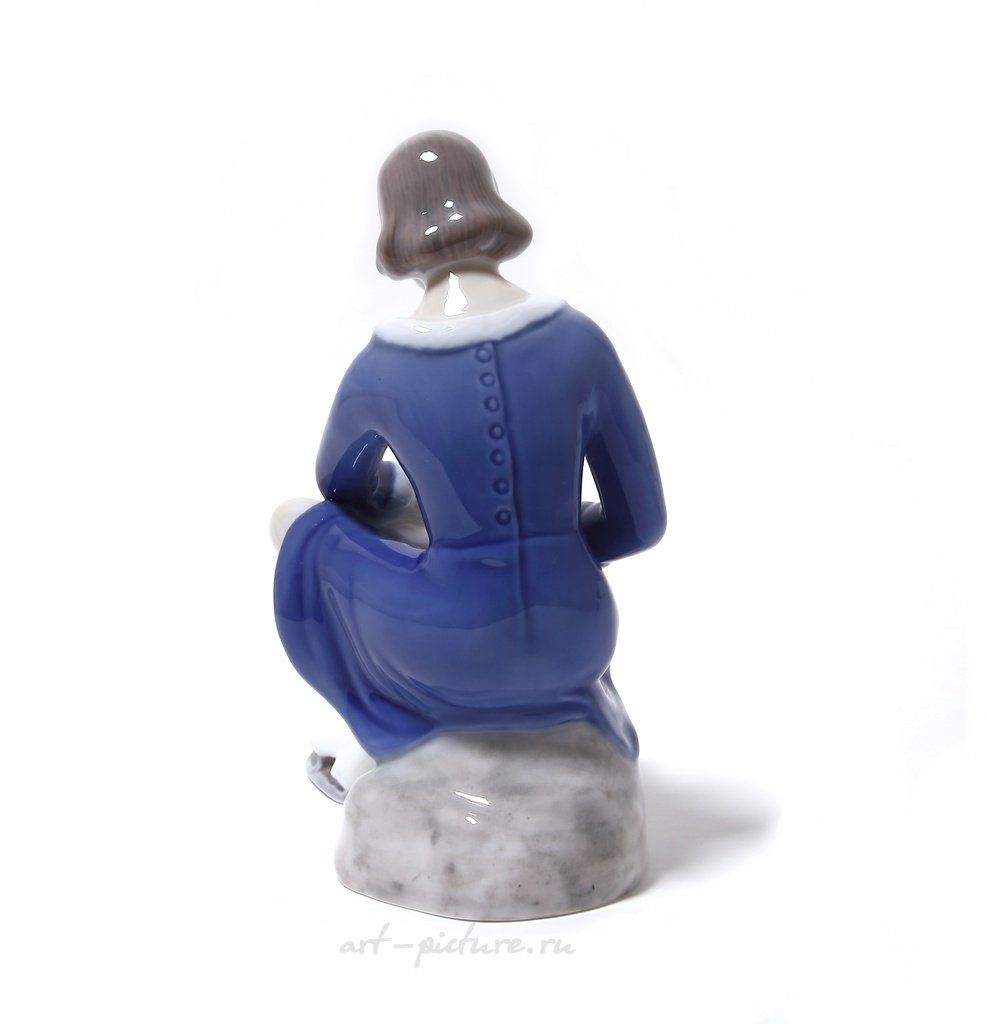 Данная статуэтка, как вы правильно подметили, изображает молодую девушку в синем платье, держащую ботинок в руках. Это создает впечатление ожидания и динамики, что действительно привносит в её образ атмосферу легкости и романтизма. В целостности с прочими качествами, это особенно характерно для работ Vita Thymann, которая работала в Bing & Grondahl и славилась своим умением передать эмоции через фарфоровые фигуры.