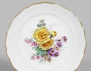 Тарелка с рельефным бортом и цветочным декором, фарфор, крытье, золочение. Тарелка, изготовленная на Севрской фарфоровой мануфактуре во Франции, в 1784 году. Фарфор, роспись, позолота, глазурь. Тарелка имеет рельефный борт. Украшена цветочным декором. На основании тарелки есть синее подглазурное клеймо, включающее две буквы "H", что соответствует 1784 году. Севрская мануфактура основана в 1740 году в городе Шантильи. В 1765 году переехала в город Севр. Выполняла заказы королевского двора. Предприятие было настолько успешным, что его пайщиками становились французские монархи – например, король Людовик XV. Это позволило предприятию получить название "Королевская мануфактура французского фарфора", а его клеймом стали две перекрещенные буквы "L". Крупнейшая коллекция севрского фарфора находится в Эрмитаже (Россия, Санкт-Петербург). Есть умеренные следы бытования. Имеются потертости. ШхДхВ (мм): 239 x 239 x 20
