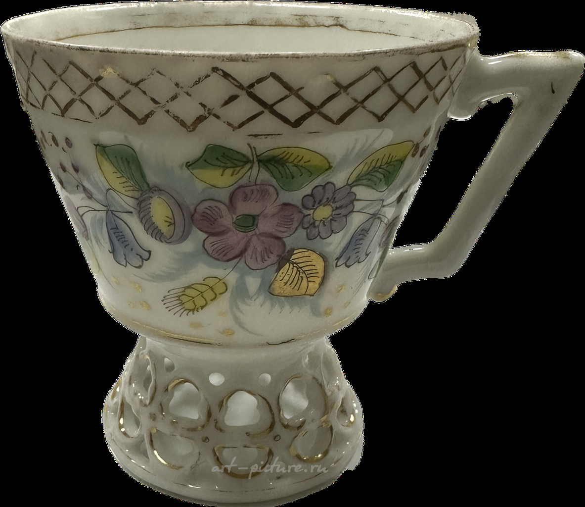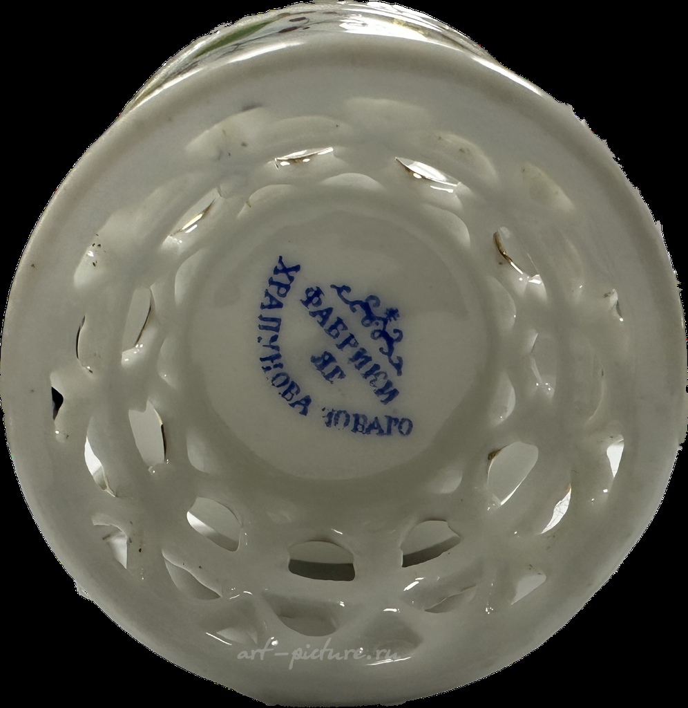 Чашка с надписью «ВЪ ДЕНЬ АНГЕЛА» Завод Я.Г. Храпунова-Нового Россия, Московская губерния, вторая половина XIX века Фарфор, роспись, золочение; В. – 8 см Марка: Фабрики Я.Г. Храпунова-Нового Фарфоровая чашка с надписью золотом «ВЪ ДЕНЬ АНГЕЛА» выполнена на знаменитом фарфоровом предприятии Якова Храпунова-Нового. Фабрика братьев Новых начала свое существование в 1818 году в деревне Кузяево Богородского уезда Московской губернии, неподалеку от Гжели. Предприятие основали три брата Новых, поставив во главу фабрики старшего Ивана. Средний брат Тихон руководил заводом примерно в 1830-е годы, возможно, совместно с младшим братом Семеном. Последний возглавил фарфорово-фаянсовую мануфактуру в 1840-х годах. Под руководством братьев фабрика процветала и выпускала фарфор и фаянс. За несколько десятилетий завод достиг достаточного расцвета, чтобы стать одним из лучших предприятий Гжели. До нашего времени сохранилось довольно много изделий завода, которые отличает хорошее качество. Фарфоровый завод Н.С. Храпунова располагался также в Московской губернии и работал с 1815 по 1840 годы. На предприятии изготавливалась фарфоровая и фаянсовая посуда и скульптура. К середине 1850-х годов наследница завода Агафья Новая вышла замуж за Якова Храпунова, внука заводчика Н. Храпунова. Так как после женитьбы Храпунов становился владельцем завода, он решил сохранить фамилию бывших владельцев и взял себе фамилию Храпунова-Нового. С этого периода фабрика носит имя нового хозяина. За годы своего правления Я.Г. Храпунов-Новый существенно расширил производство, оснастив цеха современными гидравлическими прессами, шлифовальными и паровыми машинами, а также прочим необходимым оборудованием. Если в 1853 году, когда фабрикант только начинал руководить заводом, на нем трудилось 45 человек, то в 1871 году рабочих стало 245, что говорит о значительном масштабе производства. При Храпунове-Новом завод превратился в одно из крупнейших керамических предприятий в стране. В 1918 году предприятие было национализировано и переименовано в Кузяевский фарфоровый завод.