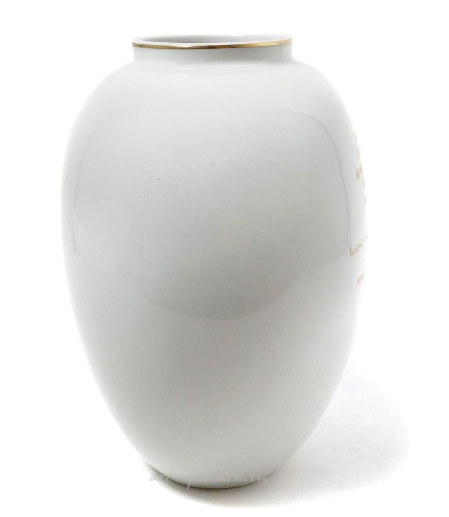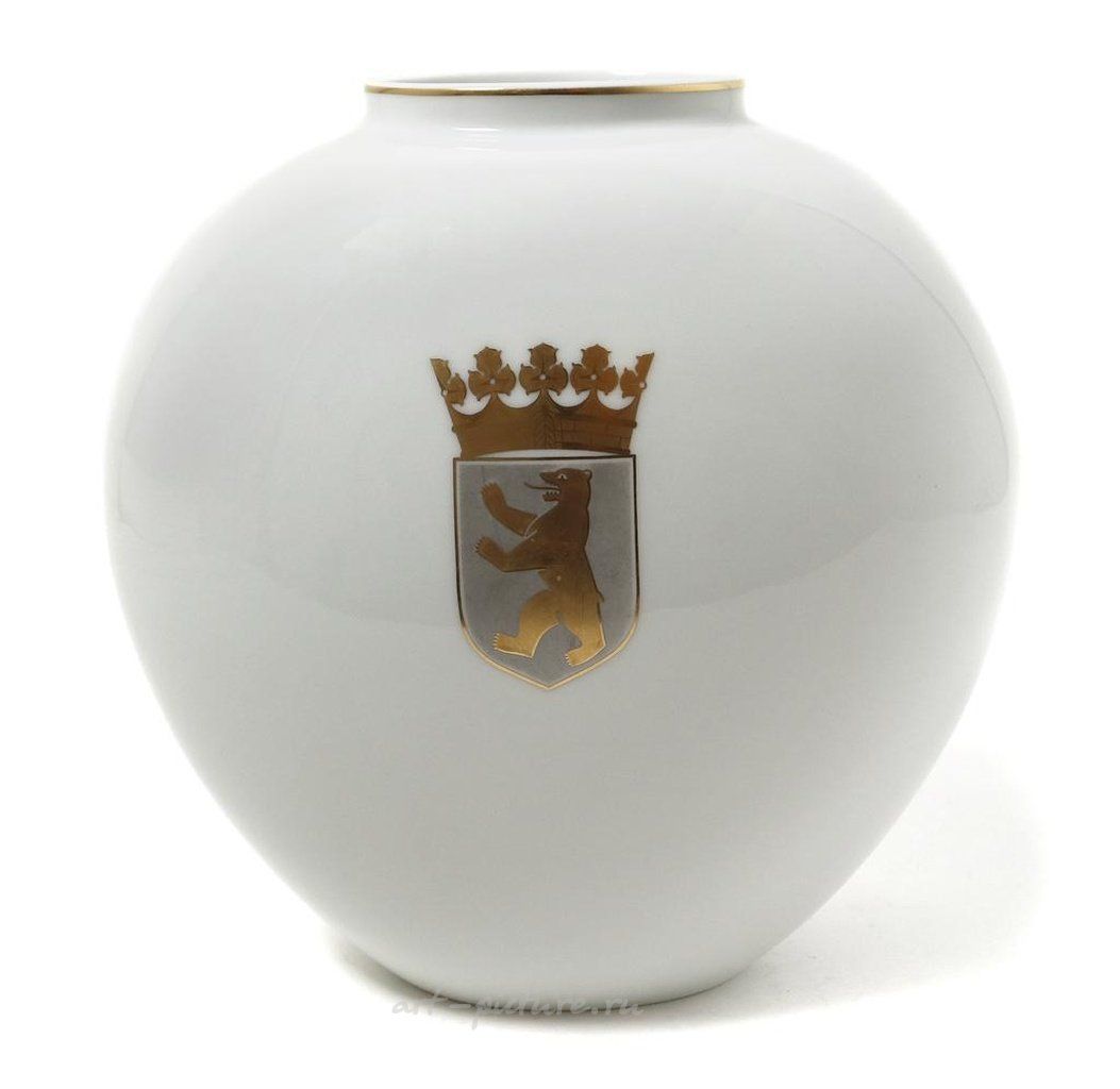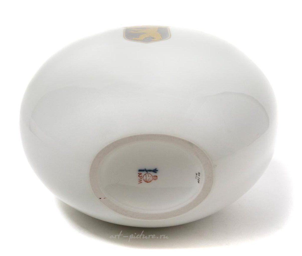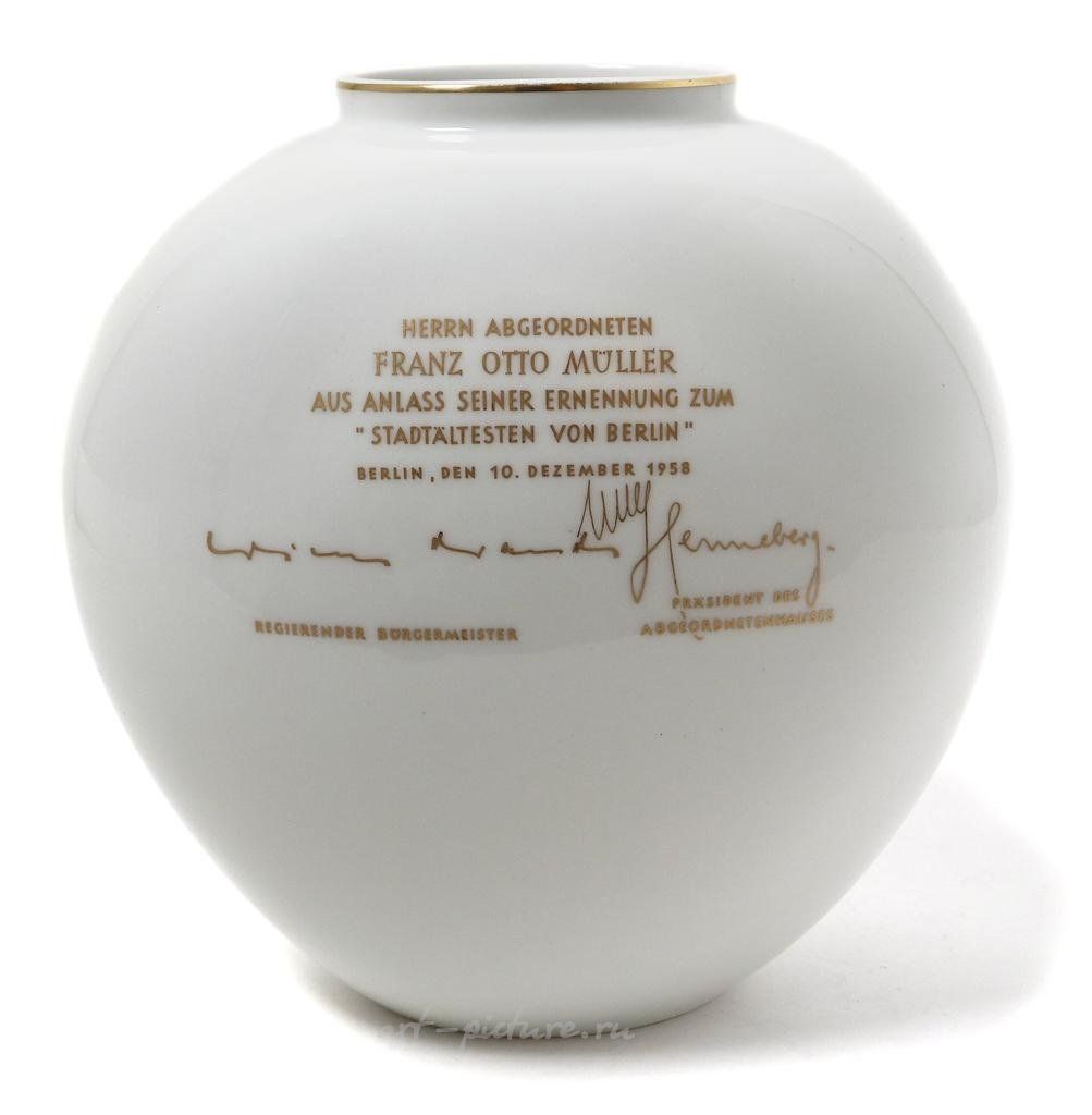Фарфоровая ваза с гербом города Берлин. С надписью на оборотной стороне вазы: "Почетному члену Францу Отто Мюллеру По случаю его назначения "Старейшиной города Берлина". Берлин, 10 декабря 1958 год". Германия, Королевская фарфоровая мануфактура, г. Берлин (Königliche Porzellan-Manufaktur Berlin, KPM), 1958 год. Клеймо производителя. Высота: 13 см, размер основания: 22,5 х 8,5 см. Без сколов, повреждений и без реставраций.