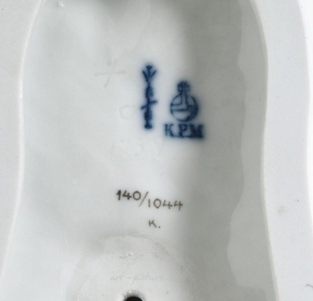 Королевская фарфоровая мануфактура (КРМ)Переход фабрики в другую собственность -1763 г.После перехода фабрики Гоцковского к Фридриху II она стала называться Королевской фарфоровой мануфактурой, и ее клеймом с самого начала был королевский скипетр. Одновременно стали искать собственные залежи каолиновой глины. И уже в 1765 г. такие залежи нашли в Силезии, а в 1771 г. обнаружили прекрасную каолиновую глину в Бахвице около Галле и в Зенневице и Морле, и эти залежи Берлинская мануфактура использует по сей день. Фарфор из этой глины имеет синевато-белый оттенок. В то время фабрика выполняла многочисленные заказы короля, среди которых преобладали заказы на сервизы. В 1765 г. Фридрих II заказал сервиз, состоящий из большого количества разнородных предметов для нового дворца в Потсдаме. На изготовление этого сервиза ушло более двух с половиной лет. Этот сервиз стал шедевром фабрики, он превосходно подходил к стилю всего дворца, и на каждом из предметов была очаровательная и гармоничная роспись. Особенно одинаковый стиль росписи был на тарелках. Изящные мотивы из ракушек (rocaille) переходят от краев к середине, которую занимает букет цветов. Поля краев тарелок, между узорами из ракушек, покрывает тонкая золотая сетка на оранжево-красном фоне, на других полях на желтом фоне помещены золотые веточки. Преобладают тона: пурпурно-фиолетовый, желто-зеленый и коричнево-красный, а также тонкая позолота. Кроме описанного «потсдамского» сервиза фабрика выполнила еще много других для разных королевских резиденций, такие как «зеленый», «желтый», «красный», «японский», «с корзиной цветов». Для подарка короля русской императрице фабрика сделала в 1772 г. сервиз золотисто-зеленого цвета с миниатюрами, изображающими победу русских над турками.В этот период для фабрики делал проекты декорирования также польский художник Даниэль Ходовецкий. Помимо королевских заказов фабрика выпускала массовую продукцию, не так богато украшенную, зато более дешевую и доступную обывателю. Кроме столовых сервизов выпускались кофейные сервизы, декоративные вазы и глазурованные статуэтки. Однако вазы и статуэтки не обладали той оригинальностью форм и легкостью, какие были у изделий некоторых других мануфактур того времени - мейсенской, венской или севрской. В 1775 г. в течение короткого времени скульптурной мастерской руководил Иоганн Эпштейн. Он сделал ряд фигурок и групп фигурок, в том числе на польскую тематику. Они изображали шляхтичей в польских костюмах и всадников с лошадьми.После смерти короля Фридриха II в стиле изделий стал преобладать классицизм. Когда умер Элиас Мейер (1789), его место занял скульптор Карл Фридрих Ризе. Изделия этого периода - бисквиты в классическом стиле, сделанные в основном по проектам знаменитого скульптора Шадо- ва. Вместе с Шадова работал архитектор Ганс Христиан Дженелли, сторонник строгого классицизма. В этот период было сильно влияние Севра и керамики Веджвуда.Портреты в медальонах, украшавшие берлинскую ампирную посуду и чашки, являются по большей части произведениями скульптора Леонарда Поша. Реакцией на холодный классицизм был стиль бидермейер, отвечающий мещанской любви к удобству и уюту. Изделия Берлинской фабрики именно в таком стиле имели широкой сбыт. Это были массовые изделия, но с определенным специфичным очарованием этой эпох